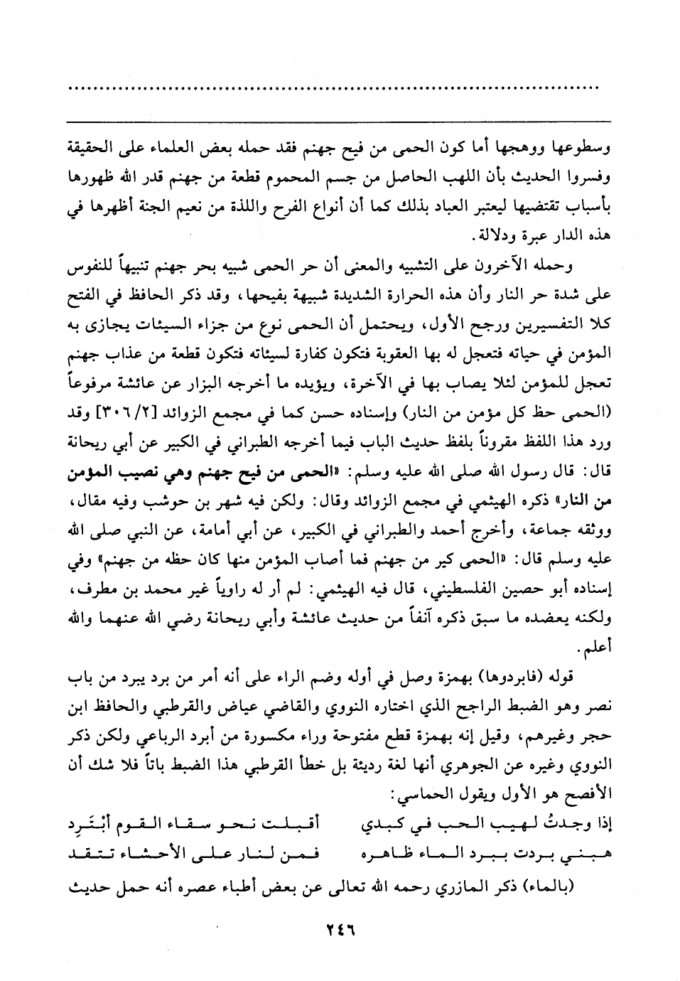 وسطوعها ووهجها أما كون الحمى من فيح جهنم فقد حمله بعض العلماء على الحقيقة وفسروا الحديث بأن اللهب الحاصل من جسم المحموم قطعة من جهنم قدر الله ظهورها بأسباب تقتضيها ليعتبر العباد بذلك كما أن أنواع الفرح واللذة من نعيم الجنّة أظهرها في هذه الدار عبرة ودلالة.