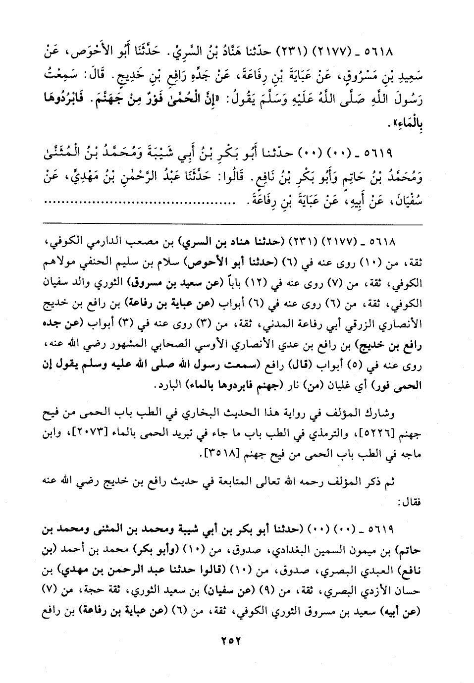 ٥٦١٨ - (٢١٧٧) (٢٣١) (حَدَّثَنَا هنَّاد بن السري) بن مصعب الدارمي الكوفي، ثقة، من (١٠) روى عنه في (٦) (حَدَّثَنَا أبو الأحوص) سلام بن سليم الحنفي مولاهم الكوفي، ثقة، من (٧) روى عنه في (١٢) بابا (عن سعيد بن مسروق) الثوري والد سفيان الكوفي، ثقة، من (٦) روى عنه في (٦) أبواب (عن عباية بن رفاعة) بن رافع بن خديج الأنصاري الزرقي أبي رفاعة المدني، ثقة، من (٣) روى عنه في (٣) أبواب (عن جده رافع بن خديج) بن رافع بن عدي الأنصاري الأوسي الصحابي المشهور رضي الله عنه، روى عنه في (٥) أبواب (قال) رافع (سمعت رسول الله صلى الله عليه وسلم يقول إن الحمى فور) أي غليان (من) نار (جهنم فابردوها بالماء) البارد.
