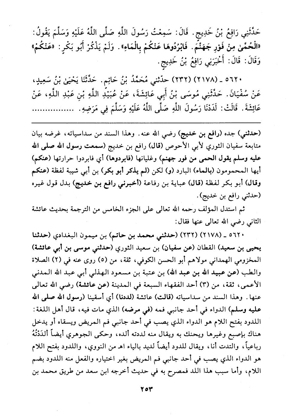(حدثني) جده (رافع بن خديج) رضي الله عنه. وهذا السند من سداسياته، غرضه بيان متابعة سفيان الثوري لأبي الأحوص (قال) رافع بن خديج (سمعت رسول الله صلى الله عليه وسلم يقول الحمى من فور جهنم) وغليانها (فابردوها) أي فابردوا حرارتها (عنكم) أيها المحمومون (بالماء) البارد (و) لكن (لم يذكر أبو بكر) بن أبي شيبة لفظة (عنكم وقال) أبو بكر لفظة (قال) عباية بن رفاعة (أخبرني رافع بن خديج) بدل قول غيره (حدثني رافع بن خديج).