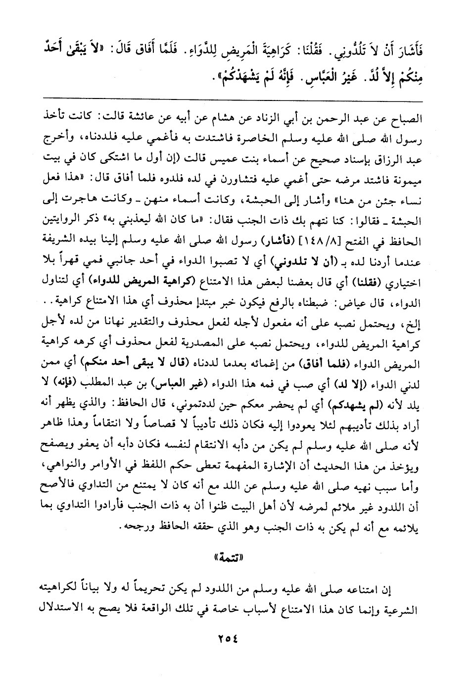 الصباح عن عبد الرحمن بن أبي الزناد عن هشام عن أبيه عن عائشة قالت: كانت تأخذ رسول الله صلى الله عليه وسلم الخاصرة فاشتدت به فأغمي عليه فلددناه، وأخرج عبد الرزاق بإسناد صحيح عن أسماء بنت عميس قالت (إن أول ما اشتكى كان في بيت ميمونة فاشتد مرضه حتَّى أغمي عليه فتشاورن في لده فلدوه فلما أفاق قال: "هذا فعل نساء جئن من هنا" وأشار إلى الحبشة، وكانت أسماء منهن - وكانت هاجرت إلى الحبشة - فقالوا: كنا نتهم بك ذات الجنب فقال: "ما كان الله ليعذبني به، ذكر الروايتين الحافظ في الفتح [٨/ ١٤٨] (فأشار) رسول الله صلى الله عليه وسلم إلينا بيده الشريفة عندما أردنا لده بـ (أن لا تلدوني) أي لا تصبوا الدواء في أحد جانبي فمي قهرًا بلا اختياري (فقلنا) أي قال بعضنا لبعض هذا الامتناع (كراهية المريض للدواء) أي لتناول الدواء، قال عياض: ضبطناه بالرفع فيكون خبر مبتدأ محذوف أي هذا الامتناع كراهية .. إلخ، ويحتمل نصبه على أنَّه مفعول لأجله لفعل محذوف والتقدير نهانا من لده لأجل كراهية المريض للدواء، ويحتمل نصبه على المصدرية لفعل محذوف أي كرهه كراهية المريض الدواء (فلما أفاق) من إغمائه بعدما لددناه (قال لا يبقى أحد منكم) أي ممن لدني الدواء (إلا لد) أي صب في فمه هذا الدواء (غير العباس) بن عبد المطلب (فإنه) لا يلد لأنه (لم يشهدكم) أي لم يحضر معكم حين لددتموني، قال الحافظ: والذي يظهر أنَّه أراد بذلك تأديبهم لئلا يعودوا إليه فكان ذلك تأديبًا لا قصاصًا ولا انتقامًا وهذا ظاهر لأنه صلى الله عليه وسلم لم يكن من دأبه الانتقام لنفسه فكان دأبه أن يعفو ويصفح ويؤخذ من هذا الحديث أن الإشارة المفهمة تعطى حكم اللفظ في الأوامر والنواهي، وأما سبب نهيه صلى الله عليه وسلم عن اللد مع أنَّه كان لا يمتنع من التداوي فالأصح أن اللدود غير ملائم لمرضه لأن أهل البيت ظنوا أن به ذات الجنب فأرادوا التداوي بما يلائمه مع أنَّه لم يكن به ذات الجنب وهو الَّذي حققه الحافظ ورجحه.