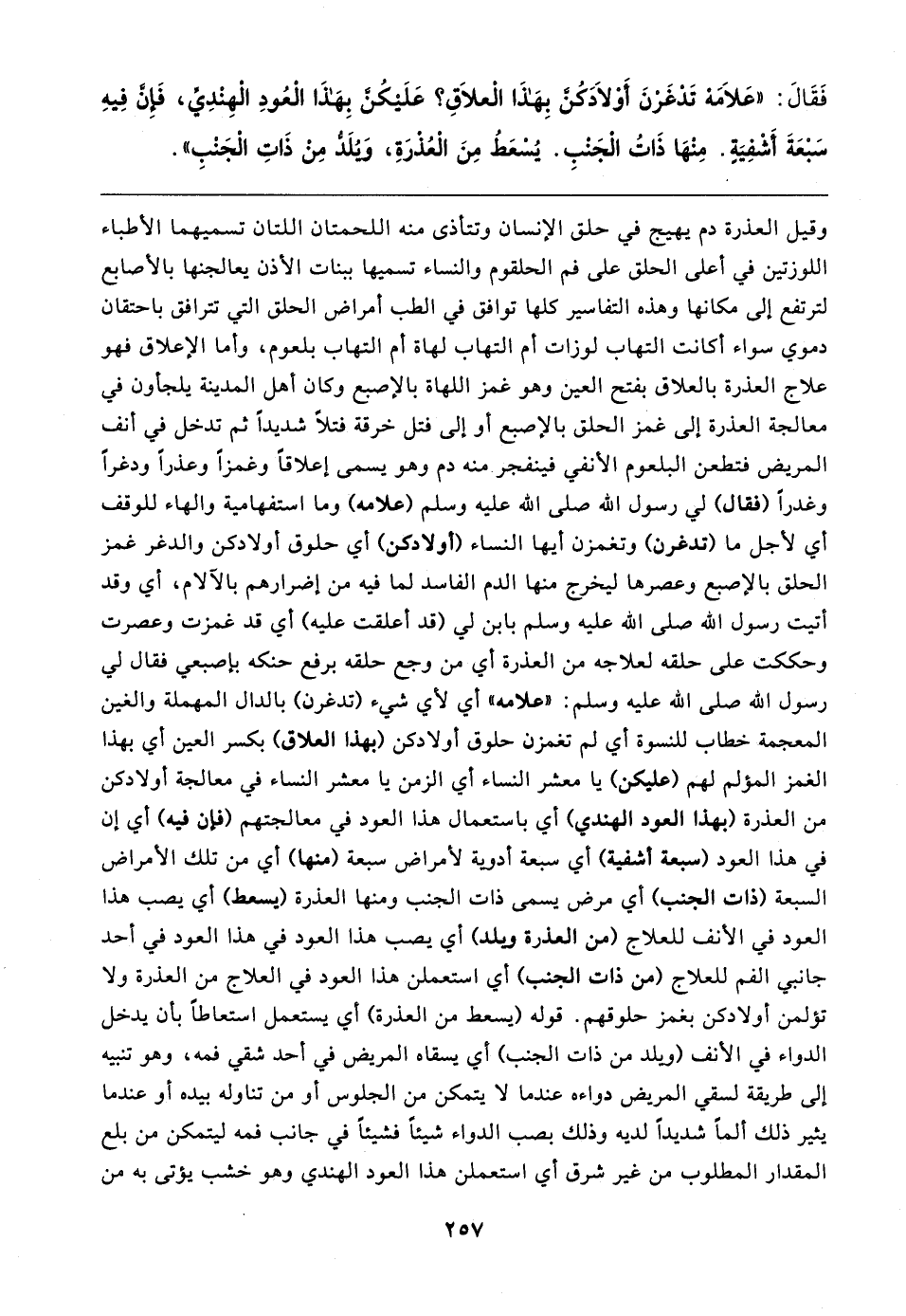 وقيل العذرة دم يهيج في حلق الإنسان وتتأذى منه اللحمتان اللتان تسميهما الأطباء اللوزتين في أعلى الحلق على فم الحلقوم والنساء تسميها ببنات الأذن يعالجنها بالأصابع لترتفع إلى مكانها وهذه التفاسير كلها توافق في الطب أمراض الحلق التي تترافق باحتقان دموي سواء أكانت التهاب لوزات أم التهاب لهاة أم التهاب بلعوم، وأما الإعلاق فهو علاج العذرة بالعلاق بفتح العين وهو غمز اللهاة بالإصبع وكان أهل المدينة يلجاون في معالجة العذرة إلى غمز الحلق بالإصبع أو إلى فتل خرقة فتلًا شديدًا ثم تدخل في أنف المريض فتطعن البلعوم الأنفي فينفجر - منه دم وهو يسمى إعلاقًا وغمزًا وعذرًا ودغرًا وغدرًا (فقال) لي رسول الله صلى الله عليه وسلم (علامه) وما استفهامية والهاء للوقف أي لأجل ما (تدغرن) وتغمزن أيها النساء (أولادكن) أي حلوق أولادكن والدغر غمز الحلق بالإصبع وعصرها ليخرج منها الدم الفاسد لما فيه من إضرارهم بالالام، أي وقد أتيت رسول الله صلى الله عليه وسلم بابن لي (قد أعلقت عليه) أي قد غمزت وعصرت وحككت على حلقه لعلاجه من العذرة أي من وجع حلقه برفع حنكه بإصبعي فقال لي رسول الله صلى الله عليه وسلم: "علامه" أي لأي شيء (تدغرن) بالدال المهملة والغين المعجمة خطاب للنسوة أي لم تغمزن حلوق أولادكن (بهذا العلاق) بكسر العين أي بهذا الغمز المؤلم لهم (عليكن) يا معشر النساء أي الزمن يا معشر النساء في معالجة أولادكن من العذرة (بهذا العود الهندي) أي باستعمال هذا العود في معالجتهم (فإن فيه) أي إن في هذا العود (سبعة أشفية) أي سبعة أدوية لأمراض سبعة (منها) أي من تلك الأمراض السبعة (ذات الجنب) أي مرض يسمى ذات الجنب ومنها العذرة (يسعط) أي يصب هذا العود في الأنف للعلاج (من العذرة ويلد) أي يصب هذا العود في هذا العود في أحد جانبي الفم للعلاج (من ذات الجنب) أي استعملن هذا العود في العلاج من العذرة ولا تؤلمن أولادكن بغمز حلوقهم. قوله (يسعط من العذرة) أي يستعمل استعاطًا بأن يدخل الدواء في الأنف (ويلد من ذات الجنب) أي يسقاه المريض في أحد شقي فمه، وهو تنبيه إلى طريقة لسقي المريض دواءه عندما لا يتمكن من الجلوس أو من تناوله بيده أو عندما يثير ذلك ألمًا شديدًا لديه وذلك بصب الدواء شيئًا فشيئًا في جانب فمه ليتمكن من بلع المقدار المطلوب من غير شرق أي استعملن هذا العود الهندي وهو خشب يؤتى به من