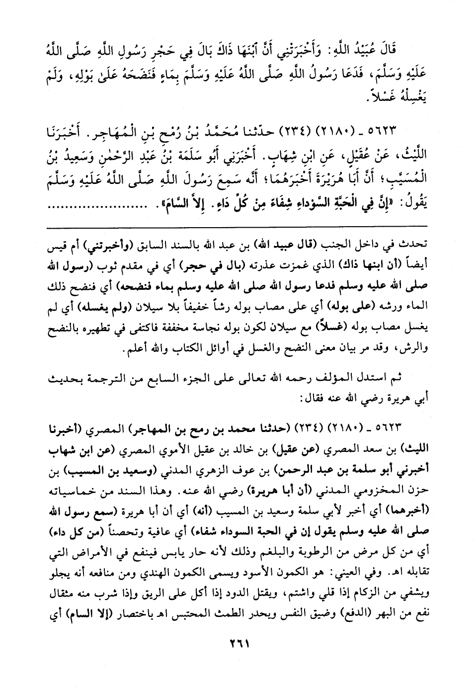 ٥٦٢٣ - (٢١٨٠) (٢٣٤) حدَّثِنا مُحَمَّدُ بن رُمْحِ بْنِ الْمُهَاجِرِ. أَخْبَرَنَا اللَّيثُ، عَنْ عُقَيلٍ، عَنِ ابْنِ شِهَابٍ. أخْبَرَنِي أَبُو سَلَمَة بن عَبْدِ الرَّحْمَنِ وَسَعِيدُ بْنُ الْمُسَيَّبِ؛ أَنَّ أَبَا هُرَيرَةَ أَخْبَرَهُمَا؛ أَنَّه سَمِعَ رَسُولَ اللهِ صَلَّى اللهُ عَلَيهِ وَسَلَّمَ يَقُولُ: "إِنَّ فِي الْحَبَّةِ السَّوداءِ شِفَاءَ مِنْ كُلِّ دَاءٍ. إلا السَّامَ"