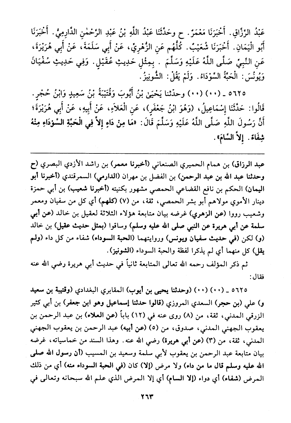 ٥٦٢٥ - (٠٠) (٠٠) (وحدثنا يحيى بن أيوب) المقابري البغدادي (وقتيبة بن سعيد و) علي (بن حجر) السعدي المروزي (قالوا حَدَّثَنَا إسماعيل وهو ابن جعفر) بن أبي كثير الزرقي المدني، ثقة، من (٨) روى عنه في (١٢) بابا (عن العلاء) بن عبد الرحمن بن يعقوب الجهني المدني، صدوق، من (٥) (عن أبيه) عبد الرحمن بن يعقوب الجهني المدني، ثقة، من (٣) (عن أبي هريرة) رضي الله عنه. وهذا السند من خماسياته، غرضه بيان متابعة عبد الرحمن بن يعقوب لأبي سلمة وسعيد بن المسيب (أن رسول الله صلى الله عليه وسلم قال ما من داء) ولا مرض (إلا) كان (في الحبة السوداء منه) أي من ذلك المرض (شفاء) أي دواء (إلا السام) أي إلَّا المرض الَّذي علم الله سبحانه وتعالى في