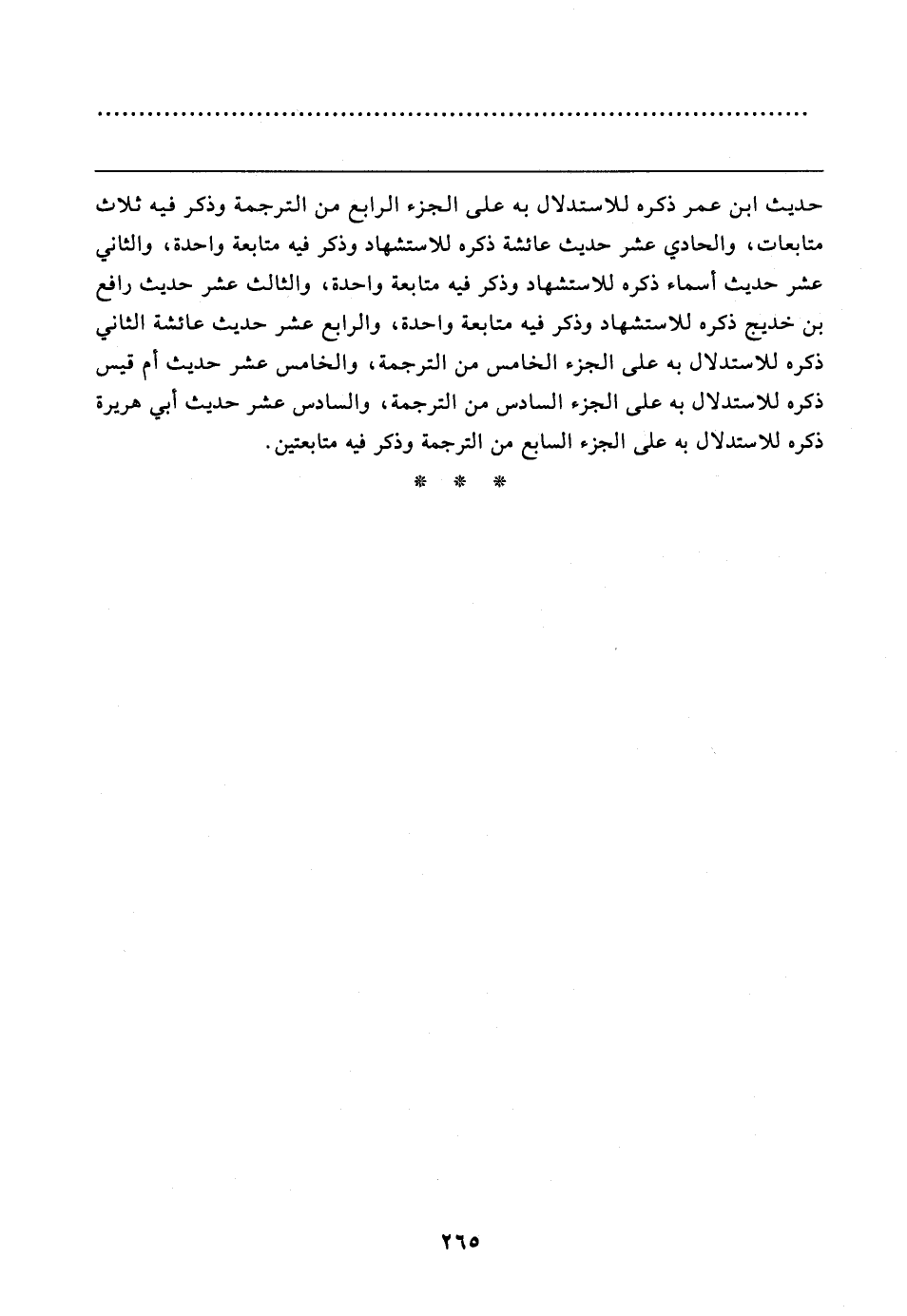 حديث ابن عمر ذكره للاستدلال به على الجزء الرابع من الترجمة وذكر فيه ثلاث متابعات، والحادي عثر حديث عائشة ذكره للاستشهاد وذكر فيه متابعة واحدة، والثاني عثر حديث أسماء ذكره للاستشهاد وذكر فيه متابعة واحدة، والثالث عثر حديث رافع بن خديج ذكره للاستشهاد وذكر فيه متابعة واحدة، والرابع عشر حديث عائشة الثاني ذكره للاستدلال به على الجزء الخامس من الترجمة، والخامس عشر حديث أم قيس ذكره للاستدلال به على الجزء السادس من الترجمة، والسادس عشر حديث أبي هريرة ذكره للاستدلال به على الجزء السابع من الترجمة وذكر فيه متابعتين.