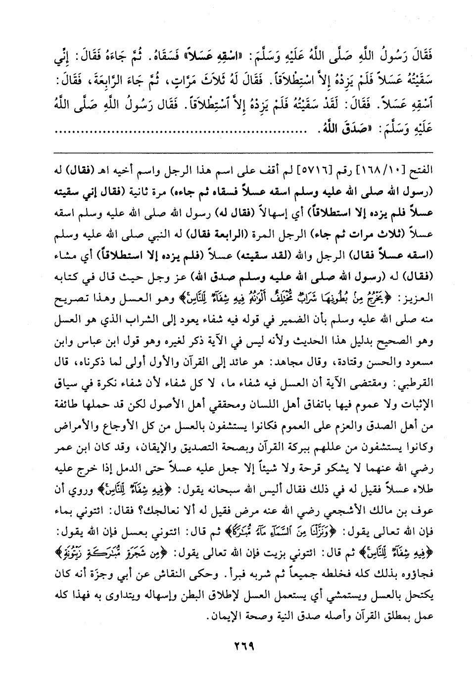 فَقَال رَسُولُ اللهِ صَلى اللهُ عَلَيهِ وَسَلمَ: "اسْقِهِ عَسَلًا" فَسَقَاهُ. ثُم جَاءَهُ فَقَال: إِني سَقَيتُهُ عَسَلًا فَلَمْ يَزِدْهُ إلا اسْتِطْلاقًا. فَقَال لَهُ ثَلاثَ مَرَّاتٍ، ثُم جَاءَ الرَّابِعَةَ، فَقَال: اسْقِهِ عَسَلًا. فَقَال: لَقَد سَقَيتُهُ فَلَمْ يَزِدهُ إلا استِطْلاقًا. فَقَال رَسُولُ اللهِ صَلى اللهُ عَلَيهِ وَسَلمَ: "صَدَقَ اللهُ