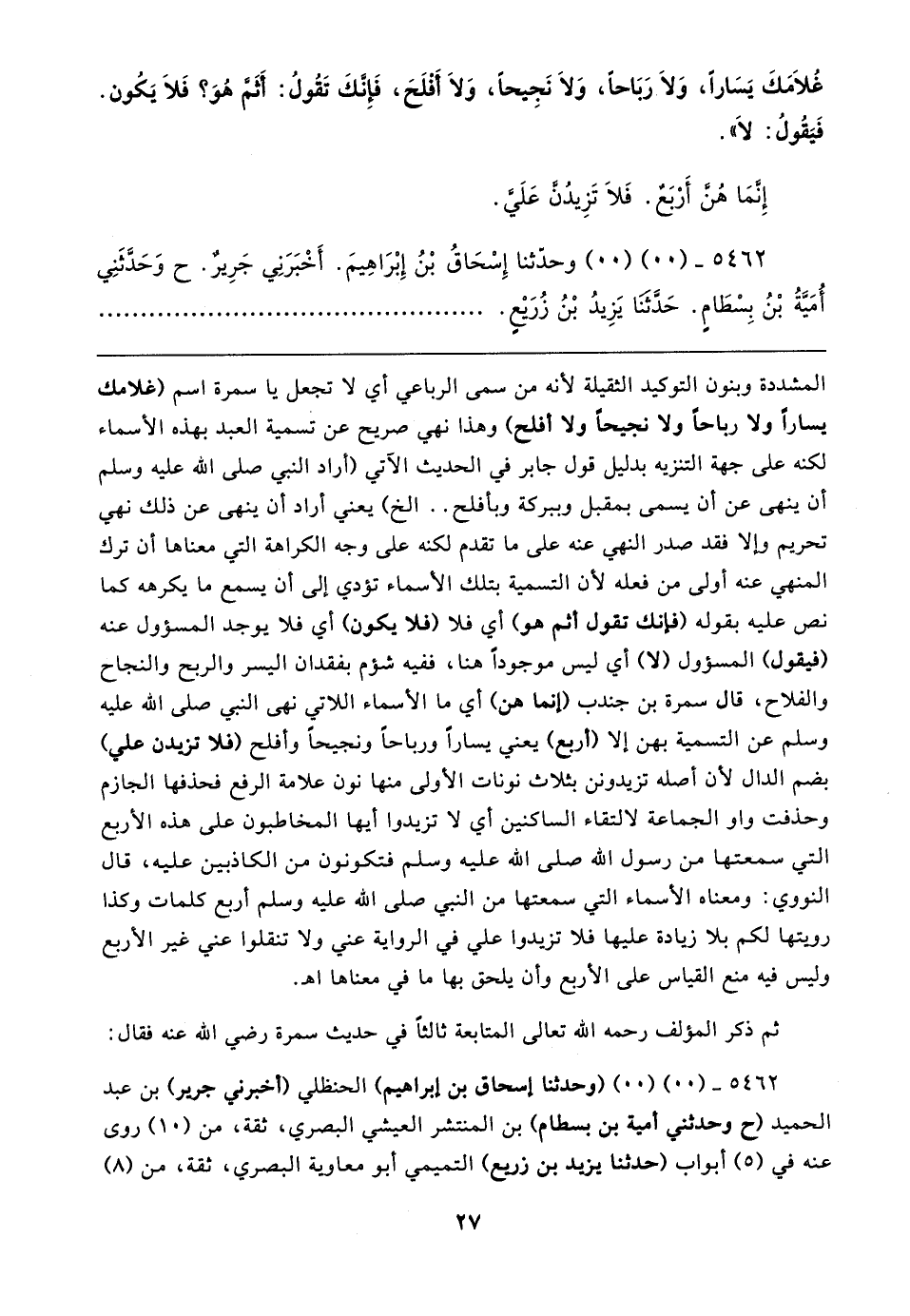 غُلامَكَ يَسَارًا، وَلَا رَبَاحًا، وَلَا نَجِيحًا، وَلَا أَفلَحَ، فَإِنكَ تَقُولُ: أَثم هُو؟ فَلَا يَكُون. فَيَقُولُ: لَا". إِنَّمَا هُنَّ أربع. فَلَا تَزِيدُن عَلَيَّ.