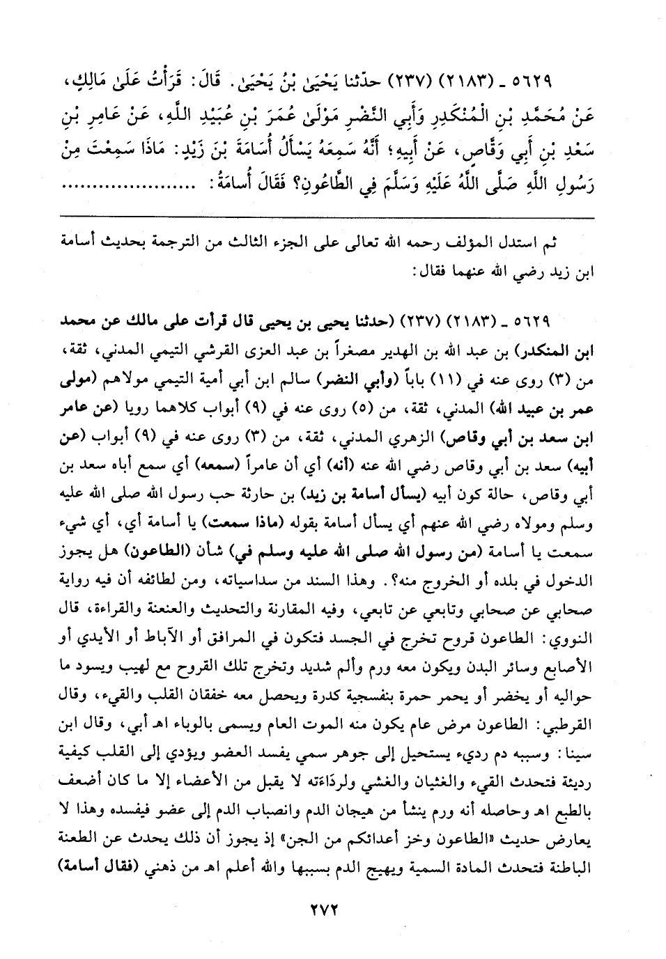 ٩ ٥٦٢ - (٢١٨٣) (٢٣٧) (حدثنا يحيى بن يحيى قال قرأت على مالك عن محمد بن المنكدر) بن عبد الله بن الهدير مصغرًا بن عبد العزى القرشي التيمي المدني، ثقة، من (٣) روى عنه في (١١) بابا (وأبي النضر) سالم بن أبي أمية التيمي مولاهم (مولى عمر بن عبيد الله) المدني، ثقة، من (٥) روى عنه في (٩) أبواب كلاهما رويا (عن عامر بن سعد بن أبي وقاص) الزهري المدني، ثقة، من (٣) روى عنه في (٩) أبواب (عن أبيه) سعد بن أبي وقاص رضي الله عنه (أنه) أي أن عامرًا (سمعه) أي سمع أباه سعد بن أبي وقاص، حالة كون أبيه (يسال أسامة بن زيد) بن حارثة حب رسول الله صلى الله عليه وسلم ومولاه رضي الله عنهم أي يسال أسامة بقوله (ماذا سمعت) يا أسامة أي، أي شيء سمعت يا أسامة (من رسول الله صلى الله عليه وسلم في) شأن (الطاعون) هل يجوز الدخول في بلده أو الخروج منه؟ . وهذا السند من سداسياته، ومن لطائفه أن فيه رواية صحابي عن صحابي وتابعي عن تابعي، وفيه المقارنة والتحديث والعنعنة والقراءة، قال النووي: الطاعون قروح تخرج في الجسد فتكون في المرافق أو الأباط أو الأيدي أو الأصابع وسائر البدن ويكون معه ورم وألم شديد وتخرج تلك القروح مع لهيب ويسود ما حواليه أو يخضر أو يحمر حمرة بنفسجية كدرة ويحصل معه خفقان القلب والقيء، وقال القرطبي: الطاعون مرض عام يكون منه الموت العام ويسمى بالوباء اهـ أبي، وقال ابن سينا: وسببه دم رديء يستحيل إلى جوهر سمي يفسد العضو ويؤدي إلى القلب كيفية رديئة فتحدث القيء والغثيان والغشي ولردَاءَته لا يقبل من الأعضاء إلا ما كان أضعف بالطبع اهـ وحاصله أنه ورم ينشأ من هيجان الدم وانصباب الدم إلى عضو فيفسده وهذا لا يعارض حديث "الطاعون وخز أعدائكم من الجن" إذ يجوز أن ذلك يحدث عن الطعنة الباطنة فتحدث المادة السمية ويهيج الدم بسببها والله أعلم اهـ من ذهني (فقال أسامة)