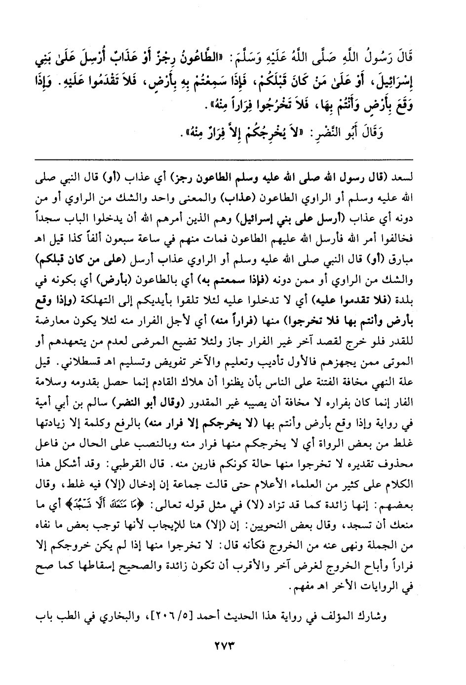 قَال رَسُولُ اللهِ صَلَى اللهُ عَلَيهِ وَسَلمَ: "الطاعُونُ رِجز أَوْ عَذَاث أُرْسِلَ عَلَى بَنِي إِسْرَائِيلَ، أَوْ عَلَى مَن كَانَ قَبْلَكُم، فَإذَا سَمِعتُمْ بِهِ بِأرْضِ، فَلَا تَقْدَمُوا عَلَيهِ. وَإذَا وَقَعَ بِأرْضِ وَأَنْتُم بِهَا، فَلَا تَخرُجُوا فِرَارًا مِنْهُا.