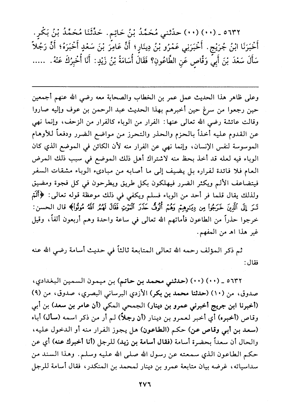 ٥٦٣٢ - (٠٠) (٠٠) حدثني مُحَمدُ بْنُ حَاتِمٍ. حَدَّثَنَا مُحَمدُ بن بَكْرٍ. أَخْبَرَنَا ابْنُ جُرَيجٍ. أَخْبَرَنِي عَمْرُو بْنُ دِينَارٍ؛ أَن عَامِرَ بْنَ سَعْد أَخْبَرَهُ؛ أَن رَجُلا سَأل سَعْدَ بْنَ أَبِي وَقاص عَنِ الطاعُونِ؛ فَقَال أُسَامَةُ بْنُ زَيدٍ: أَنَا أُخْبِرُكَ عَنْهُ
