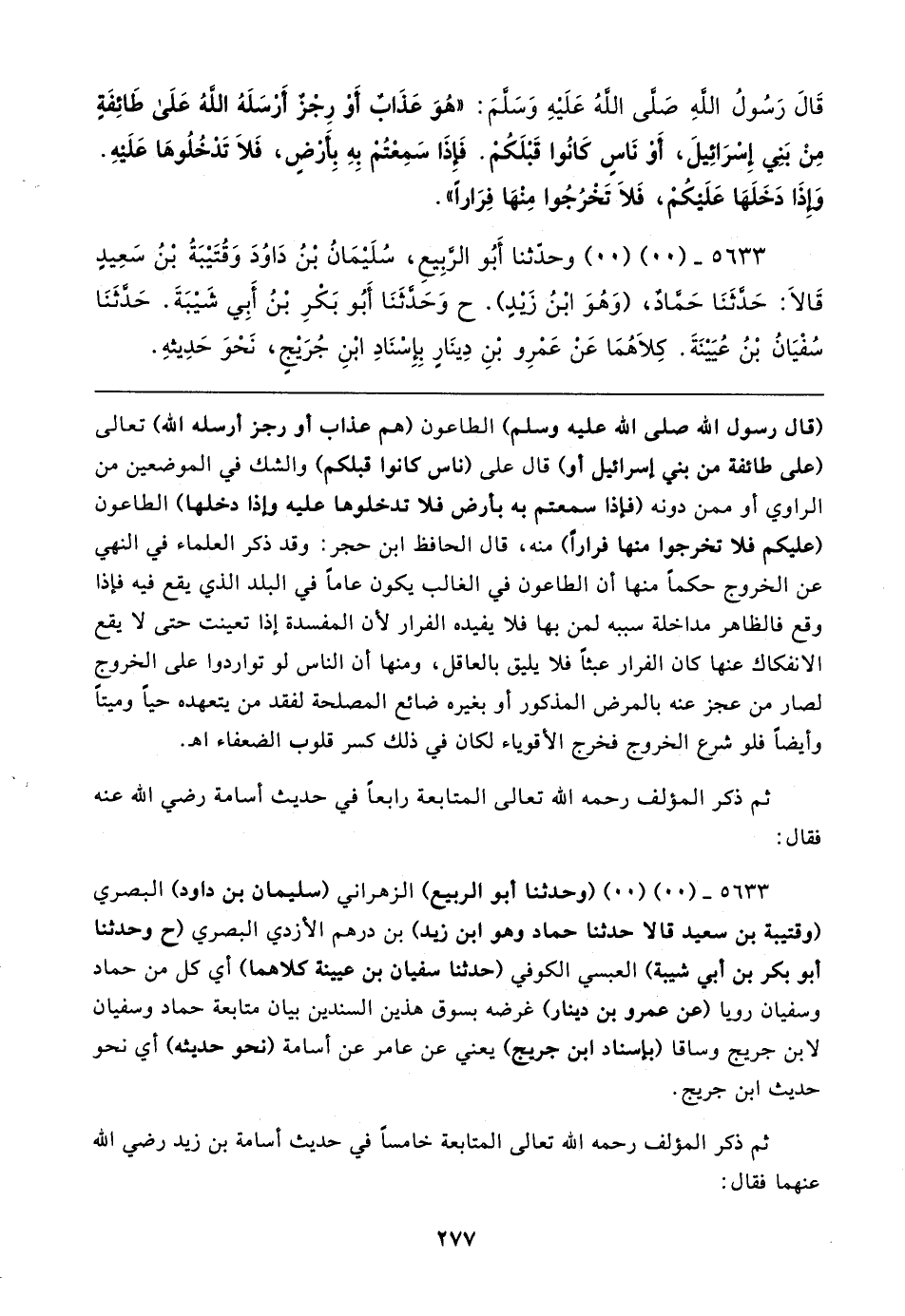 قَال رَسُولُ اللهِ صَلى اللهُ عَلَيهِ وَسَلمَ: "هُوَ عَذَابٌ أَوْ رِجْزٌ أَرْسَلَهُ اللهُ عَلَى طَائِفَة مِنْ بَنِي إِسْرَائِيلَ، أَوْ نَاسٍ كَانُوا قَبْلَكُمْ. فَإذَا سَمِعْتُم بِهِ بِأرْضٍ، فَلَا تَدخُلُوهَا عَلَيهِ. وَإِذَا دَخَلَهَا عَلَيكُمْ، فَلَا تَخْرُجُوا مِنهَا فِرَارًا.