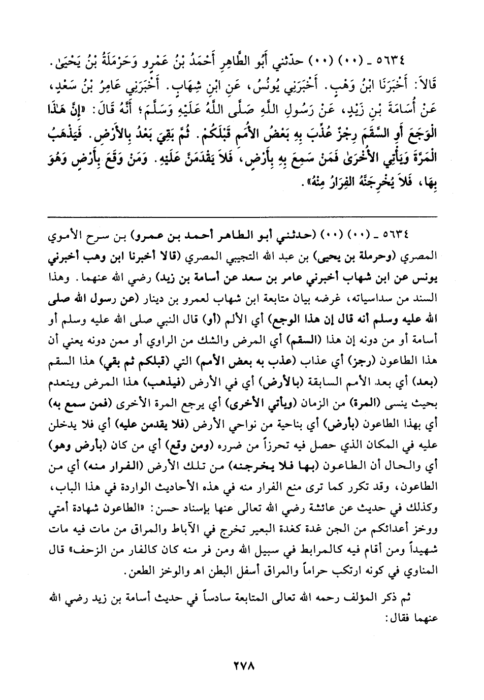 ٥٦٣٤ - (٠٠) (٠٠) حدثني أَبُو الطاهِرِ أَحْمَدُ بْنُ عَمْرٍو وَحَرْمَلَةُ بْنُ يَحيَى. قَالا: أَخبَرَنَا ابْنُ وَهْبٍ. أَخبَرَنِي يُونُسُ، عَنِ ابنِ شِهَاب. أَخبَرَنِي عَامِرُ بْنُ سَعد، عَن أُسَامَةَ بْنِ زَيد، عَنْ رَسُولِ اللهِ صَلى اللهُ عَلَيهِ وَسَلمَ؛ أَنهُ قَال: "إن هَذَا الوَجَعَ أَو السقَمَ رِجز عُذِّبَ بِهِ بَعضُ الأممِ قَبْلَكُمْ. ثُم بَقِيَ بَعْدُ بِالأَرْضِ. فَيَذْهَبُ الْمَرَّةَ وَيَأتِي الأخرَى فَمَنْ سمِعَ بِهِ بِأرضٍ، فَلَا يَقدَمَنَّ عَلَيهِ. وَمَنْ وَقَعَ بِأرض وَهُوَ بِهَا، فَلَا يخْرِجَنهُ الفِرَارُ مِنْهُ"