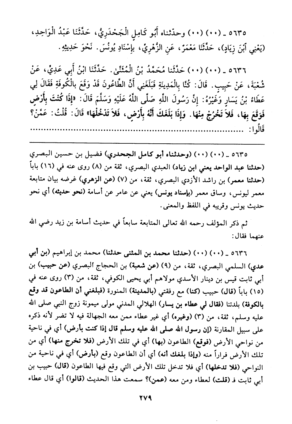٥٦٣٦ - (٠٠) (٠٠) (حدثنا محمد بن المثنى حدثنا) محمد بن إبراهيم (بن أبي عدي) السلمي البصري، ثقة، من (٩) (عن شعبة) بن الحجاج البصري (عن حبيب) بن أبي ثابت قيس بن دينار الأسدي مولاهم أبي يحيى الكوفي، ثقة، من (٣) روى عنه في (١٥) بابا (قال) حبيب (كنا) مع رفقتي (بالمدينة) المنورة (فبلغني أن الطاعون قد وقع بالكوفة) بلدتنا (فقال لي عطاء بن يسار) الهلالي المدني مولى ميمونة زوج النبي صلى الله عليه وسلم، ثقة، من (٣) (وغيره) أي غير عطاء ممن معه الجهالة فيه لا تضر لأنه ذكره على سبيل المقارنة (إن رسول الله صلى الله عليه وسلم قال إذا كنت بأرض) أي في ناحية من نواحي الأرض (فوقع) الطاعون (بها) أي في تلك الأرض (فلا تخرج منها) أي من تلك الأرض فرارًا منه (وإذا بلغك أنه) أي أن الطاعون وقع (بأرض) أي في ناحية من النواحي (فلا تدخلها) أي فلا تدخل تلك الأرض التي وقع فيها الطاعون (قال) حبيب بن أبي ثابت فـ (قلت) لعطاء ومن معه (عمن)؟ سمعت هذا الحديث (قالوا) أي قال عطاء