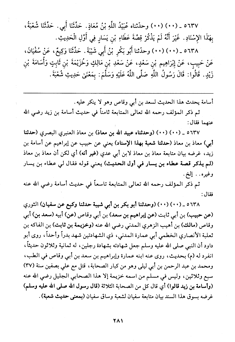 ٥٦٣٧ - (٠٠) (٠٠) (وحدثناه عبيد الله بن معاذ) بن معاذ العنبري البصري (حدثنا أبي) معاذ بن معاذ (حدثنا شعبة بهذا الإسناد) يعني عن حبيب عن إبراهيم عن أسامة بن زيد، غرضه بيان متابعة معاذ بن معاذ لابن أبي عدي (غير أنه) أي لكن أن معاذ بن معاذ (لم يذكر قصة عطاء بن يسار في أول الحديث) يعني قوله فقال لي عطاء بن يسار وغيره .. إلخ.