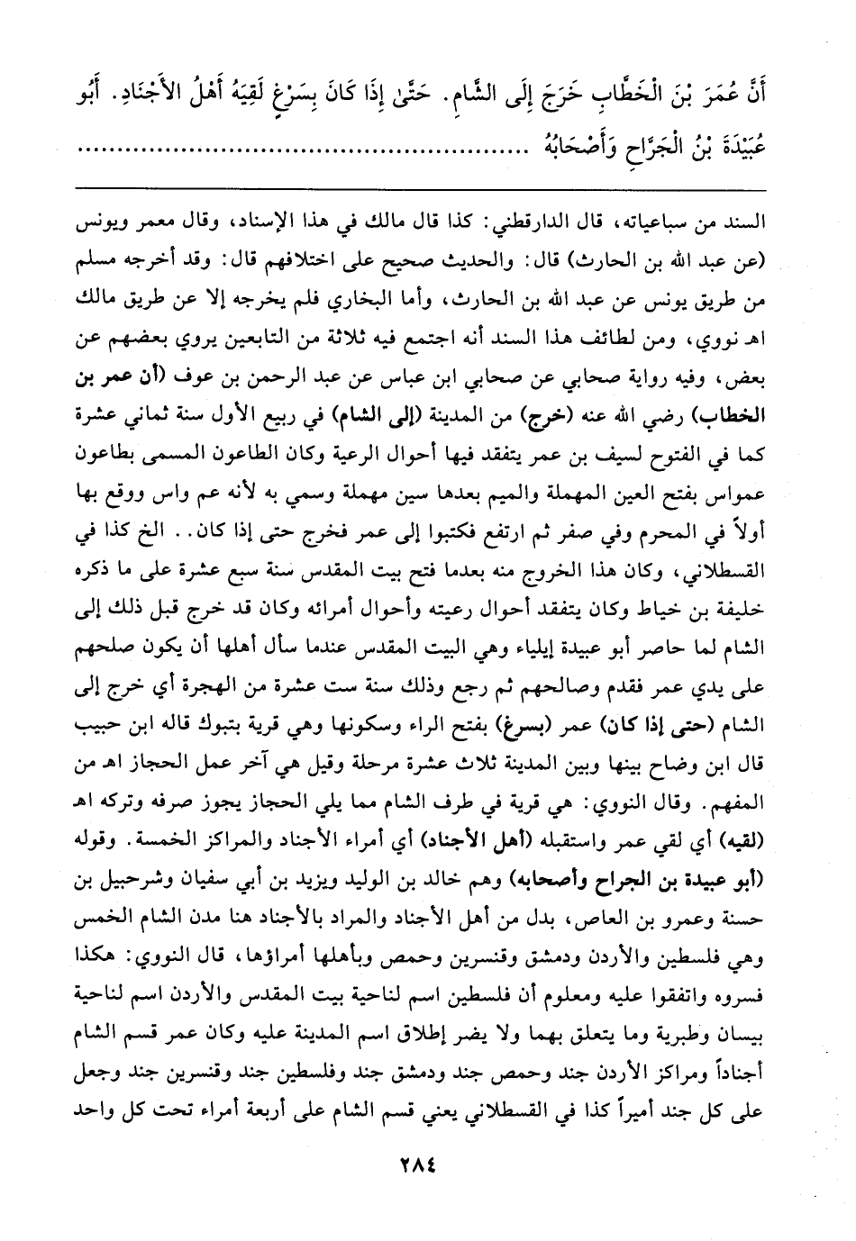 السند من سباعياته، قال الدارقطني: كذا قال مالك في هذا الإسناد، وقال معمر ويونس (عن عبد الله بن الحارث) قال: والحديث صحيح على اختلافهم قال: وقد أخرجه مسلم من طريق يونس عن عبد الله بن الحارث، وأما البخاري فلم يخرجه إلا عن طريق مالك اهـ نووي، ومن لطائف هذا السند أنه اجتمع فيه ثلاثة من التابعين يروي بعضهم عن بعض، وفيه رواية صحابي عن صحابي ابن عباس عن عبد الرحمن بن عوف (أن عمر بن الخطاب) رضي الله عنه (خرج) من المدينة (إلى الشام) في ربيع الأول سنة ثماني عشرة كما في الفتوح لسيف بن عمر يتفقد فيها أحوال الرعية وكان الطاعون المسمى بطاعون عمواس بفتح العين المهملة والميم بعدها سين مهملة وسمي به لأنه عم واس ووقع بها أولًا في المحرم وفي صفر ثم ارتفع فكتبوا إلى عمر فخرج حتى إذا كان .. الخ كذا في القسطلاني، وكان هذا الخروج منه بعد ما فتح بيت المقدس سنة سبع عشرة على ما ذكره خليفة بن خياط وكان يتفقد أحوال رعيته وأحوال أمرائه وكان قد خرج قبل ذلك إلى الشام لما حاصر أبو عبيدة إيلياء وهي البيت المقدس عندما سأل أهلها أن يكون صلحهم على يدي عمر فقدم وصالحهم ثم رجع وذلك سنة ست عشرة من الهجرة أي خرج إلى الشام (حتى إذا كان) عمر (بسرغ) بفتح الراء وسكونها وهي قرية بتبوك قاله ابن حبيب قال ابن وضاح بينها وبين المدينة ثلاث عشرة مرحلة وقيل هي آخر عمل الحجاز اهـ من المفهم. وقال النووي: هي قرية في طرف الشام مما يلي الحجاز يجوز صرفه وتركه اهـ (لقيه) أي لقي عمر واستقبله (أهل الأجناد) أي أمراء الأجناد والمراكز الخمسة. وقوله (أبو عبيدة بن الجراح وأصحابه) وهم خالد بن الوليد ويزيد بن أبي سفيان وشرحبيل بن حسنة وعمرو بن العاص، بدل من أهل الأجناد والمراد بالأجناد هنا مدن الشام الخمس وهي فلسطين والأردن ودمشق وقنسرين وحمص وبأهلها أمراؤها، قال النووي: هكذا فسروه واتفقوا عليه ومعلوم أن فلسطين اسم لناحية بيت المقدس والأردن اسم لناحية بيسان وطبرية وما يتعلق بهما ولا يضر إطلاق اسم المدينة عليه وكان عمر قسم الشام أجنادًا ومراكز الأردن جند وحمص جند ودمشق جند وفلسطين جند وقنسرين جند وجعل على كل جند أميرًا كذا في القسطلاني يعني قسم الشام على أربعة أمراء تحت كل واحد