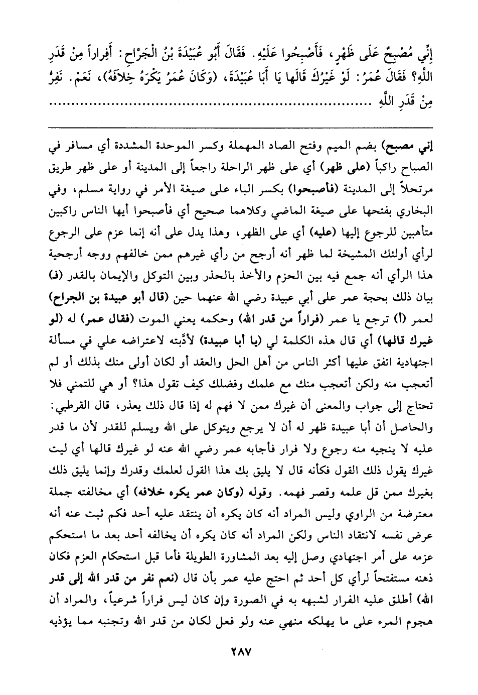 إِنِّي مُصْبِحٌ عَلَى ظَهْرٍ، فَأَصْبِحُوا عَلَيهِ. فَقَال أَبُو عُبَيدَةَ بْنُ الْجَرَّاحِ: أَفِرارًا مِن قَدَرِ اللهِ؟ فَقَال عُمَرُ: لَوْ غَيرُكَ قَالها يَا أَبَا عُبَيدَةَ، (وَكَانَ عُمَرُ يَكْرَهُ خِلافهُ)، نَعَمْ. نَفِرُّ مِنْ قَدَرِ اللهِ