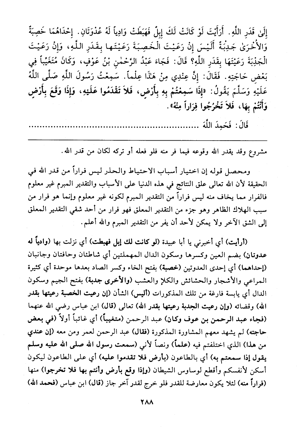 إِلَى قَدَرِ اللهِ. أَرَأَيتَ لَوْ كَانَت لَكَ إِبِلٌ فَهَبَطَتْ وَادِيًا لَهُ عُدْوَتَانِ. إِحدَاهُمَا خَصِبَةٌ وَالأُخْرَى جَدِبَةٌ أَلَيسَ إِنْ رَعَيْتَ الْخَصِبَةَ رَعَيتَها بِقَدَرِ اللهِ، وإنْ رَعَيتَ الْجَدبَةَ رَعَيتَهَا بِقَدَرِ اللهِ؟ قَال: فَجَاءَ عَبْدُ الرَّحْمنِ بْنُ عَوْفٍ، وَكَانَ مُتَغَيِّبًا في بَعْضِ حَاجَتِهِ. فَقَال: إِنَّ عِنْدِي مِنْ هَذا عِلْمًا. سَمِعْتُ رَسُولَ اللهِ صَلَّى الله عَلَيهِ وَسَلَّمَ يَقُولُ: "إِذَا سَمِعْتُمْ بِهِ بِأرْضٍ، فَلَا تَقْدَمُوا عَلَيهِ، وَإِذَا وَقَعَ بِأرْضٍ وَأَنْتُمْ بِهَا، فَلَا تَخرُجُوا فِرَارًا مِنْهُ".