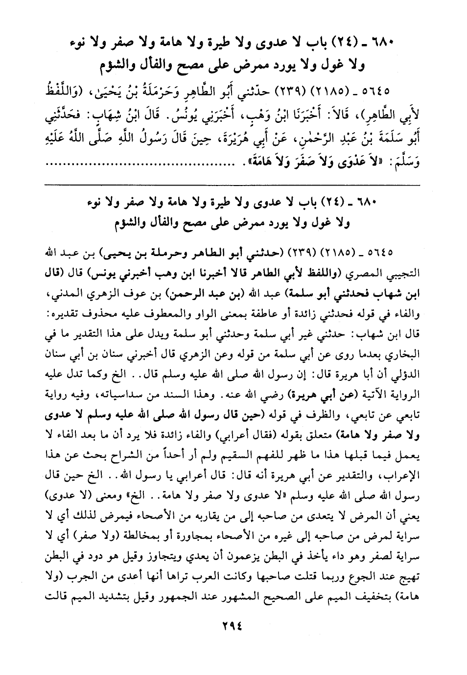 ٥٦٤٥ - (٢١٨٥) (٢٣٩) (حدثني أبو الطاهر وحرملة بن يحيى) بن عبد الله التجيبي المصري (واللفظ لأبي الطاهر قالا أخبرنا ابن وهب أخبرني يونس) قال (قال ابن شهاب فحدثني أبو سلمة) عبد الله (بن عبد الرحمن) بن عوف الزهري المدني، والفاء في قوله فحدثني زائدة أو عاطفة بمعنى الواو والمعطوف عليه محذوف تقديره: قال ابن شهاب: حدثني غير أبي سلمة وحدثني أبو سلمة ويدل على هذا التقدير ما في البخاري بعد ما روى عن أبي سلمة من قوله وعن الزهري قال أخبرني سنان بن أبي سنان الدؤلي أن أبا هريرة قال: إن رسول الله صلى الله عليه وسلم قال .. الخ وكما تدل عليه الرواية الآتية (عن أبي هريرة) رضي الله عنه. وهذا السند من سداسياته، وفيه رواية تابعي عن تابعي، والظرف في قوله (حين قال رسول الله صلى الله عليه وسلم لا عدوى ولا صفر ولا هامة) متعلق بقوله (فقال أعرابي) والفاء زائدة فلا يرد أن ما بعد الفاء لا يعمل فيما قبلها هذا ما ظهر للفهم السقيم ولم أر أحدًا من الشراح بحث عن هذا الإعراب، والتقدير عن أبي هريرة أنه قال: قال أعرابي يا رسول الله .. الخ حين قال رسول الله صلى الله عليه وسلم "لا عدوى ولا صفر ولا هامة .. الخ" ومعنى (لا عدوى) يعني أن المرض لا يتعدى من صاحبه إلى من يقاربه من الأصحاء فيمرض لذلك أي لا سراية لمرض من صاحبه إلى غيره من الأصحاء بمجاورة أو بمخالطة (ولا صفر) أي لا سراية لصفر وهو داء يأخذ في البطن يزعمون أن يعدي ويتجاوز وقيل هو دود في البطن تهيج عند الجوع وربما قتلت صاحبها وكانت العرب تراها أنها أعدى من الجرب (ولا هامة) بتخفيف الميم على الصحيح المشهور عند الجمهور وقيل بتشديد الميم قالت
