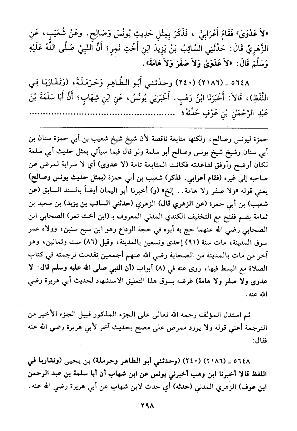 "لَا عَدوَى" فَقَامَ أَعرَابِيٌّ، فَذَكَرَ بِمِثلِ حَدِيثِ يُونُسَ وَصَالِحٍ. وعَن شُعَيبٍ، عَنِ الزُّهْرِيِّ قَال: حَدَّثَنِي السَّائِبُ بن يَزِيدَ ابنِ أُختِ نَمِرٍ؛ أَنَّ النَّبِيَّ صَلى اللهُ عَلَيهِ وَسَلَّمَ قَال: "لَا عَدْوَى وَلَا صَفَرَ وَلَا هَامَةَ".