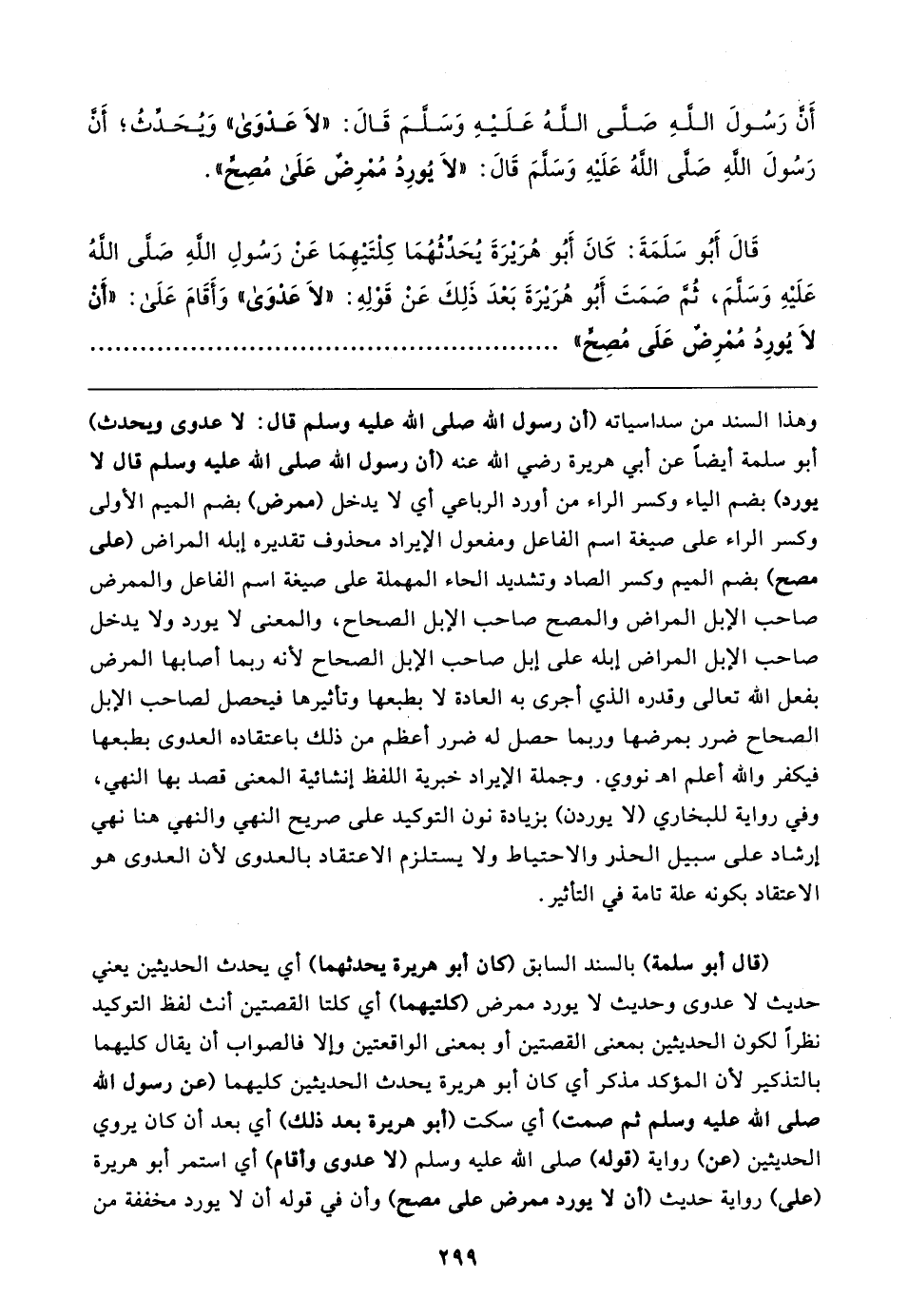 وهذا السند من سداسياته (أن رسول الله صلى الله عليه وسلم قال: لا عدوى ويحدث) أبو سلمة أيضًا عن أبي هريرة رضي الله عنه (أن رسول الله صلى الله عليه وسلم قال لا يورد) بضم الياء وكسر الراء من أورد الرباعي أي لا يدخل (ممرض) بضم الميم الأولى وكسر الراء على صيغة اسم الفاعل ومفعول الإيراد محذوف تقديره إبله المراض (على مصح) بضم الميم وكسر الصاد وتشديد الحاء المهملة على صيغة اسم الفاعل والممرض صاحب الإبل المراض والمصح صاحب الإبل الصحاح، والمعنى لا يورد ولا يدخل صاحب الإبل المراض إبله على إبل صاحب الإبل الصحاح لأنه ربما أصابها المرض بفعل الله تعالى وقدره الذي أجرى به العادة لا بطبعها وتأثيرها فيحصل لصاحب الإبل الصحاح ضرر بمرضها وربما حصل له ضرر أعظم من ذلك باعتقاده العدوي بطبعها فيكفر والله أعلم اهـ نووي. وجملة الإيراد خبرية اللفظ إنشائية المعنى قصد بها النهي، وفي رواية للبخاري (لا يوردن) بزيادة نون التوكيد على صريح النهي والنهي هنا نهي إرشاد على سبيل الحذر والاحتياط ولا يستلزم الاعتقاد بالعدوى لأن العدوي هو الاعتقاد بكونه علة تامة في التأثير.