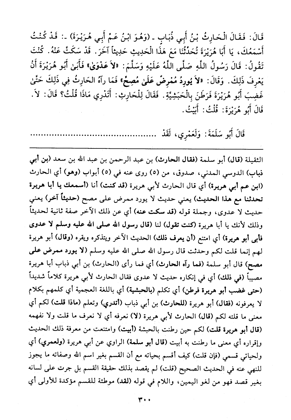 قَال: فَقَال الْحَارِثُ بْنُ أَبِي ذُبَابٍ - (وَهُوَ ابنُ عَمِّ أَبِي هُرَيرَةَ) -: قَدْ كُنْتُ أَسْمَعُكَ، يَا أَبَا هُرَيرَةَ تُحَدِّثُنَا مَعَ هَذَا الْحَدِيثِ حَدِيثًا آخَرَ. قَدْ سَكَتَّ عَنْهُ. كُنْتَ تَقُولُ: قَال رَسُولُ اللهِ صَلى اللهُ عَلَيهِ وَسَلمَ: "لَا عَدوَى" فَأَبَى أَبُو هُرَيرَةَ أَن يَعْرِفَ ذَلِكَ. وَقَال: "لَا يُورِدُ مُمْرِضٌ عَلَى مُصِحٍّ" فَمَا رآهُ الحَارِثُ في ذَلِكَ حَتَّى غَضِبَ أَبُو هُرَيرَةَ فَرَطَنَ بِالْحَبَشِيَّةِ. فَقَال لِلْحَارِثِ: أَتَدْرِي مَاذَا قُلْتُ؟ قَال: لَا. قَال أَبُو هُرَيرَةَ: قُلْتُ: أَبَيتُ.