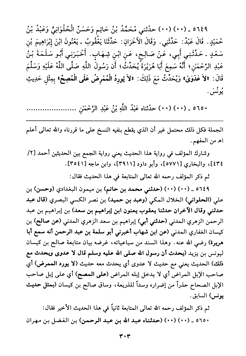 ٥٦٤٩ - (٠٠) (٠٠) (حدثني محمَّد بن حاتم) بن ميمون البغدادي (وحسن) بن علي (الحلواني) الخلال المكي (وعبد بن حميد) بن نصر الكسي البصري (قال عبد حدثني وقال الآخران حدثنا يعقوب يعنون ابن إبراهيم بن سعد) بن إبراهيم بن عبد الرحمن الزهري المدني (حدثني أبي) إبراهيم بن سعد الزهري المدني (عن صالح) بن كيسان الغفاري المدني (عن ابن شهاب أخبرني أبو سلمة بن عبد الرحمن أنه سمع أبا هريرة) رضي الله عنه. وهذا السند من سباعياته، غرضه بيان متابعة صالح بن كيسان ليونس بن يزيد (يحدث أن رسول الله صلى الله عليه وسلم قال لا عدوى وبحدث مع ذلك) الحديث يعني مع حديث لا عدوى أي يحدث معه حديث (لا يورد الممرض) أي صاحب الإبل المراض أي لا يدخل إبله المراد (على المصح) أي على إبل صاحب الإبل الصحاح حذرًا من إضراره وسدًّا للذريعة، وساق صالح بن كيسان (بمثل حديث يونس) السابق.