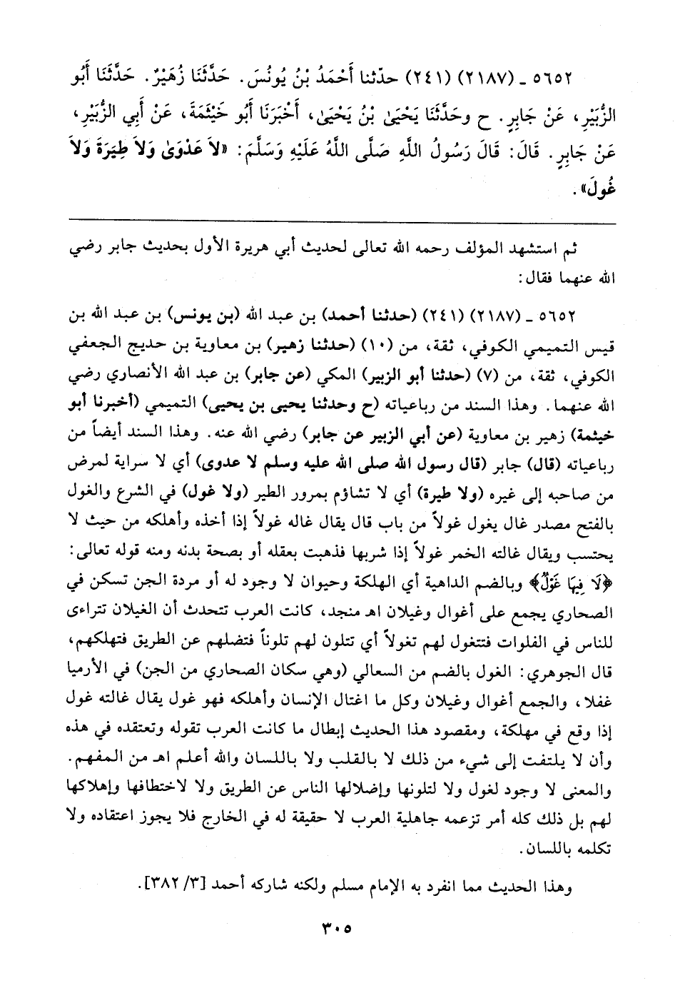 ٥٦٥٢ - (٢١٨٧) (٢٤١) (حدثنا أحمد) بن عبد الله (بن يونس) بن عبد الله بن قيس التميمي الكوفي، ثقة، من (١٠) (حدثنا زهير) بن معاوية بن حديج الجعفي الكوفي، ثقة، من (٧) (حدثنا أبو الزبير) المكي (عن جابر) بن عبد الله الأنصاري رضي الله عنهما. وهذا السند من رباعياته (ح وحدثنا يحيى بن يحيى) التميمي (أخبرنا أبو خيثمة) زهير بن معاوية (عن أبي الزبير عن جابر) رضي الله عنه. وهذا السند أيضًا من رباعياته (قال) جابر (قال رسول الله صلى الله عليه وسلم لا عدوى) أي لا سراية لمرض من صاحبه إلى غيره (ولا طيرة) أي لا تشاؤم بمرور الطير (ولا غول) في الشرع والغول بالفتح مصدر غال يغول غولًا من باب قال يقال غاله غولًا إذا أخذه وأهلكه من حيث لا يحتسب ويقال غالته الخمر غولًا إذا شربها فذهبت بعقله أو بصحة بدنه ومنه قوله تعالى: {لَا فِيهَا غَوْلٌ} وبالضم الداهية أي الهلكة وحيوان لا وجود له أو مردة الجن تسكن في الصحاري يجمع على أغوال وغيلان اهـ منجد، كانت العرب تتحدث أن الغيلان تتراءى للناس في الفلوات فتتغول لهم تغولًا أي تتلون لهم تلونًا فتضلهم عن الطريق فتهلكهم، قال الجوهري: الغول بالضم من السعالي (وهي سكان الصحاري من الجن) في الأرميا غفلا، والجمع أغوال وغيلان وكل ما اغتال الإنسان وأهلكه فهو غول يقال غالته غول إذا وقع في مهلكة، ومقصود هذا الحديث إبطال ما كانت العرب تقوله وتعتقده في هذه وأن لا يلتفت إلى شيء من ذلك لا بالقلب ولا باللسان والله أعلم اهـ من المفهم. والمعنى لا وجود لغول ولا لتلونها وإضلالها الناس عن الطريق ولا لاختطافها وإهلاكها لهم بل ذلك كله أمر تزعمه جاهلية العرب لا حقيقة له في الخارج فلا يجوز اعتقاده ولا تكلمه باللسان.