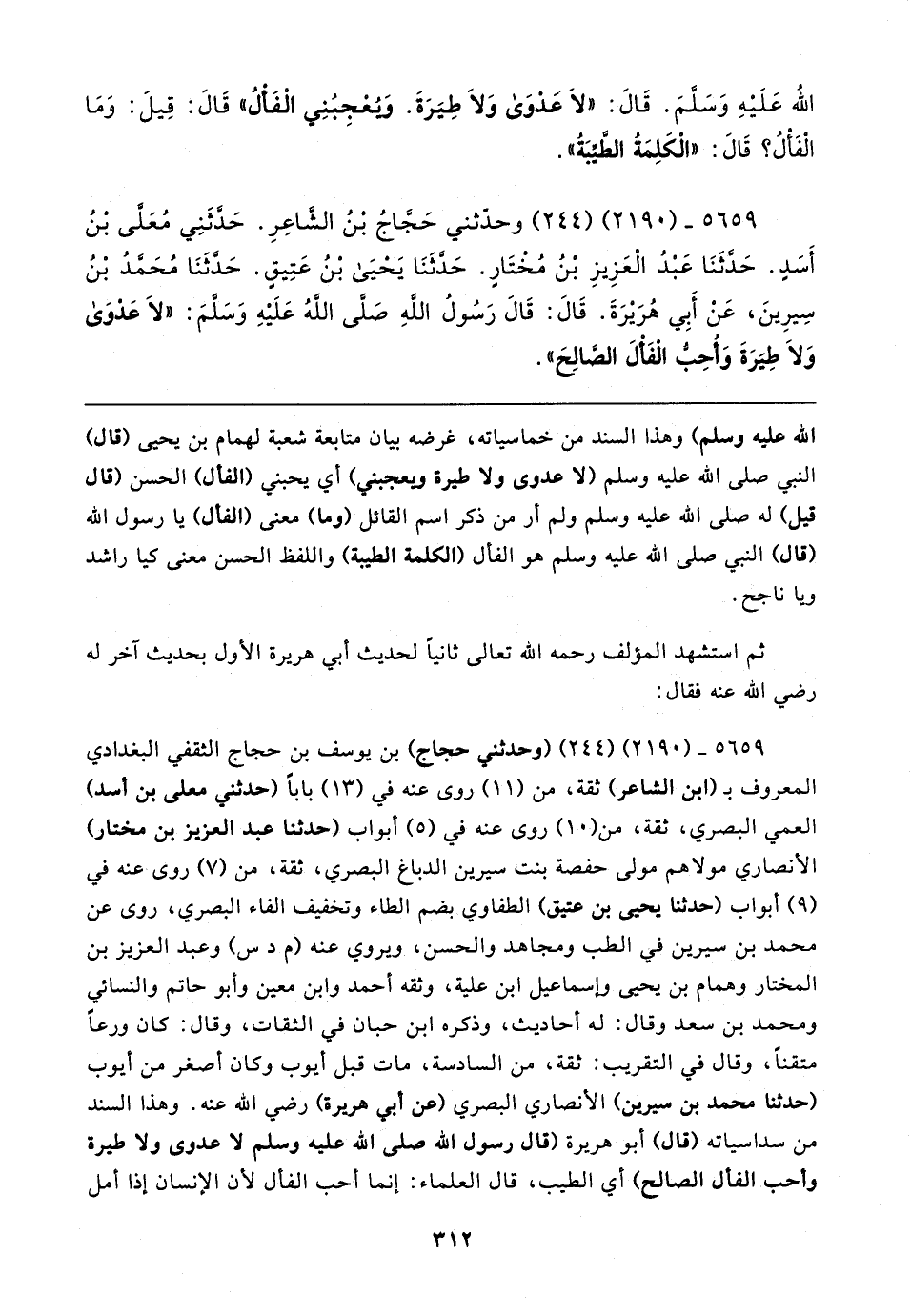 ٥٦٥٩ - (٢١٩٠) (٢٤٤) (وحدّثني حجاج) بن يوسف بن حجاج الثقفي البغدادي المعروف بـ (ابن الشاعر) ثقة، من (١١) روى عنه في (١٣) بابا (حدثني معلي بن أسد) العمي البصري، ثقة، من (١٠) روى عنه في (٥) أبواب (حدثنا عبد العزيز بن مختار) الأنصاري مولاهم مولى حفصة بنت سيرين الدباغ البصري، ثقة، من (٧) روى عنه في (٩) أبواب (حدثنا يحيى بن عتيق) الطفاوي بضم الطاء وتخفيف الفاء البصري، روى عن محمَّد بن سيرين في الطب ومجاهد والحسن، ويروي عنه (م د س) وعبد العزيز بن المختار وهمام بن يحيى وإسماعيل ابن علية، وثقه أحمد وابن معين وأبو حاتم والنسائي ومحمد بن سعد وقال: له أحاديث، وذكره ابن حبان في الثقات، وقال: كان ورعًا متقنًا، وقال في التقريب: ثقة، من السادسة، مات قبل أيوب وكان أصغر من أيوب (حدثنا محمَّد بن سيرين) الأنصاري البصري (عن أبي هريرة) رضي الله عنه. وهذا السند من سداسياته (قال) أبو هريرة (قال رسول الله صلى الله عليه وسلم لا عدوى ولا طيرة وأحب الفأل الصالح) أي الطيب، قال العلماء: إنما أحب الفأل لأن الإنسان إذا أمل