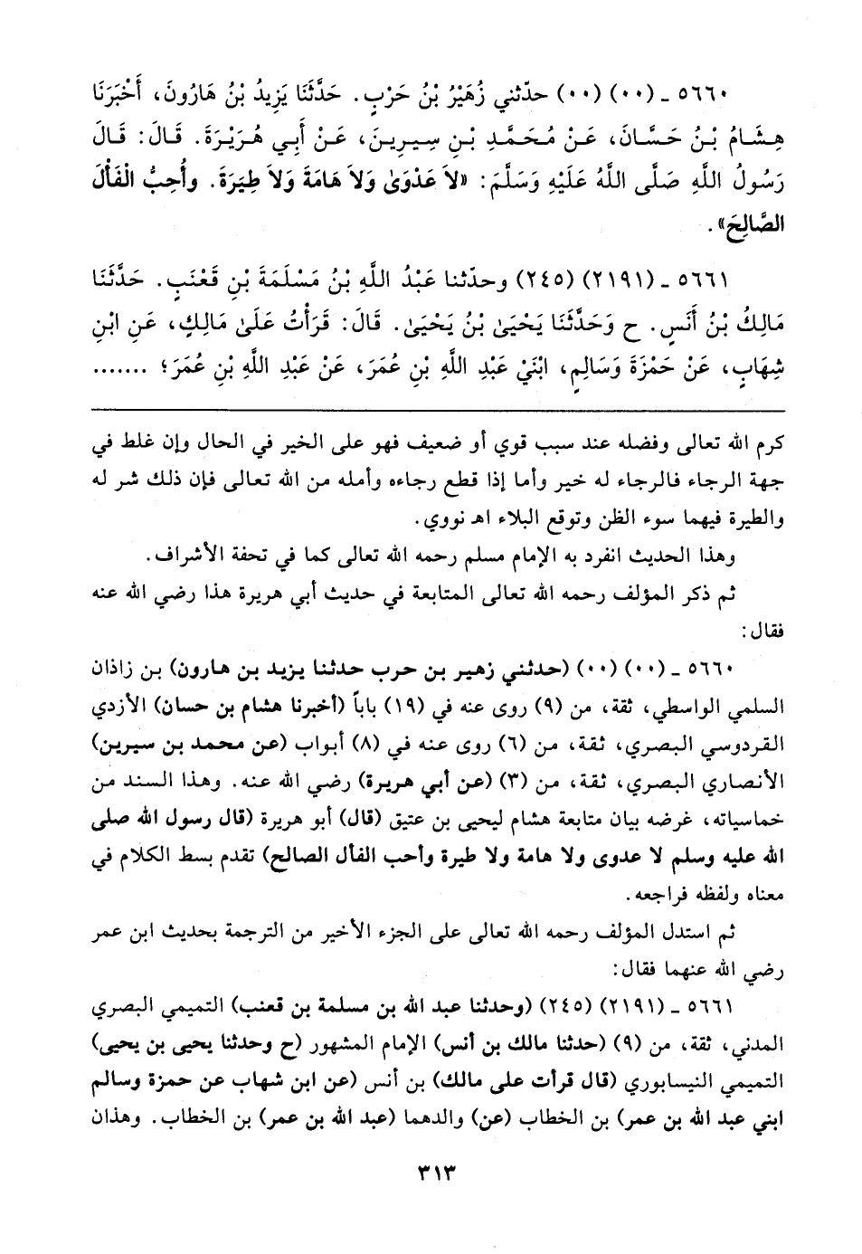 ٥٦٦٠ - (٠٠) (٠٠) حدّثني زُهَيرُ بن حَرْبٍ. حَدَّثَنَا يَزِيدُ بْنُ هَارُونَ، أَخْبَرَنَا هِشَامُ بْنُ حَسَّانَ، عَنْ مُحَمَّدِ بْنِ سِيرِينَ، عَن أَبِي هُرَيرَةَ. قَال: قَال رَسُولُ اللهِ صَلى اللهُ عَلَيهِ وَسَلمَ: "لَا عَدْوَى وَلَا هَامَةَ وَلَا طِيَرَةَ. وأُحِبُّ الْفَألَ الصَّالح".