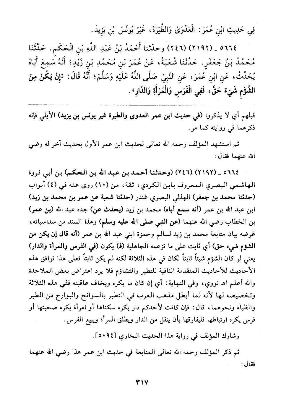 ٥٦٦٤ - (٢١٩٢) (٢٤٦) (وحدثنا أحمد بن عبد الله بن الحكم) بن أبي فروة الهاشمي البصري المعروف بابن الكردي، ثقة، من (١٠) روى عنه في (٤) أبواب (حدثنا محمَّد بن جعفر) الهذلي البصري غندر (حدثنا شعبة عن عمر بن محمَّد بن زيد) ابن عبد الله بن عمر (أنه سمع أباه) محمَّد بن زيد (يحدث عن) جده عبد الله (بن عمر) بن الخطاب رضي الله عنهما (عن النبي صلى الله عليه وسلم) وهذا السند من سداسياته، غرضه بيان متابعة محمَّد بن زيد لسالم وحمزة ابني عبد الله بن عمر (أنه قال إن يكن من الشوم شيء حق) أي ثابت على ما تزعمه الجاهلية (فـ) يكون (في الفرس والمرأة والدار) يعني لو كان الشؤم شيئًا ثابتًا لكان في هذه الثلاثة لكنه لم يكن ثابتًا فعلى هذا توافق هذه الأحاديث للأحاديث المتقدمة النافية للتطير والتشاؤم فلا يرد اعتراض بعض الملاحدة والله أعلم اهـ نووي، وفي النهاية: أي إن كان ما يكره ويخاف عاقبته ففي هذه الثلاثة وتخصيصه لها لأنه لما أبطل مذهب العرب في التطير بالسوانح والبوارح من الطير والظباء ونحوهما، قال: فإن كانت لأحدكم دار يكره سكناها أو امرأة يكره صحبتها أو فرس يكره ارتباطها فليفارقها بأن ينقل من الدار ويطلق المرأة ويبيع الفرس.