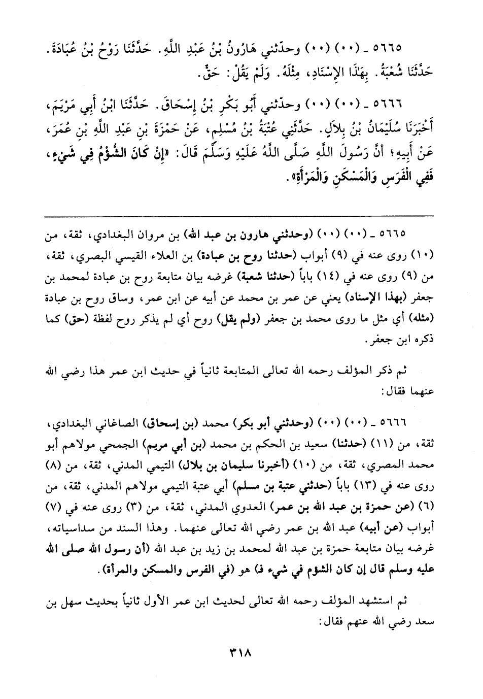 ٥٦٦٦ - (٠٠) (٠٠) (وحدّثني أبو بكر) محمَّد (بن إسحاق) الصاغاني البغدادي، ثقة، من (١١) (حدثنا) سعيد بن الحكم بن محمَّد (بن أبي مريم) الجمحي مولاهم أبو محمَّد المصري، ثقة، من (١٠) (أخبرنا سليمان بن بلال) التيمي المدني، ثقة، من (٨) روى عنه في (١٣) بابا (حدثني عتبة بن مسلم) أبي عتبة التيمي مولاهم المدني، ثقة، من (٦) (عن حمزة بن عبد الله بن عمر) العدوي المدني، ثقة، من (٣) روى عنه في (٧) أبواب (عن أبيه) عبد الله بن عمر رضي الله تعالى عنهما. وهذا السند من سداسياته، غرضه بيان متابعة حمزة بن عبد الله لمحمد بن زيد بن عبد الله (أن رسول الله صلى الله عليه وسلم قال إن كان الشؤم في شيء فـ) ـهو (في الفرس والمسكن والمرأة).