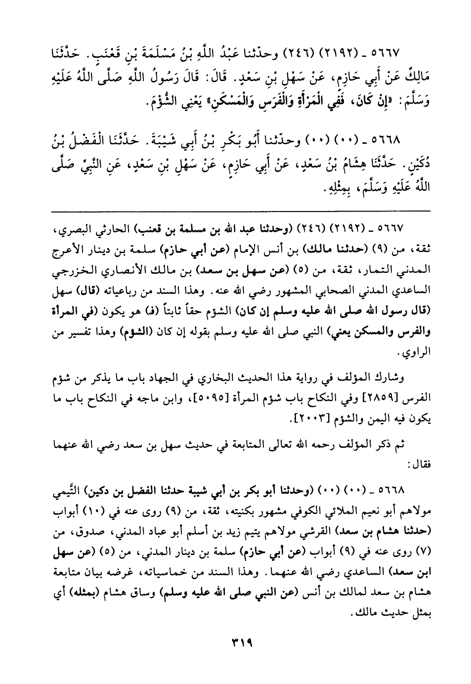 ٥٦٦٧ - (٢١٩٢) (٢٤٦) وحدّثنا عَبْدُ اللهِ بن مَسلَمَةَ بْنِ قَعنَبٍ. حَدَّثَنَا مَالِكٌ عَنْ أَبِي حَازِمٍ، عَن سَهلِ بنِ سَعْدٍ. قَال: قَال رَسُولُ اللهِ صَلى اللهُ عَلَيهِ وَسَلمَ: "إنْ كَانَ، فَفِي الْمَرْأَةِ وَالفَرَسِ وَالْمَسْكَنِ" يَعْنِي الشُّؤْمَ.