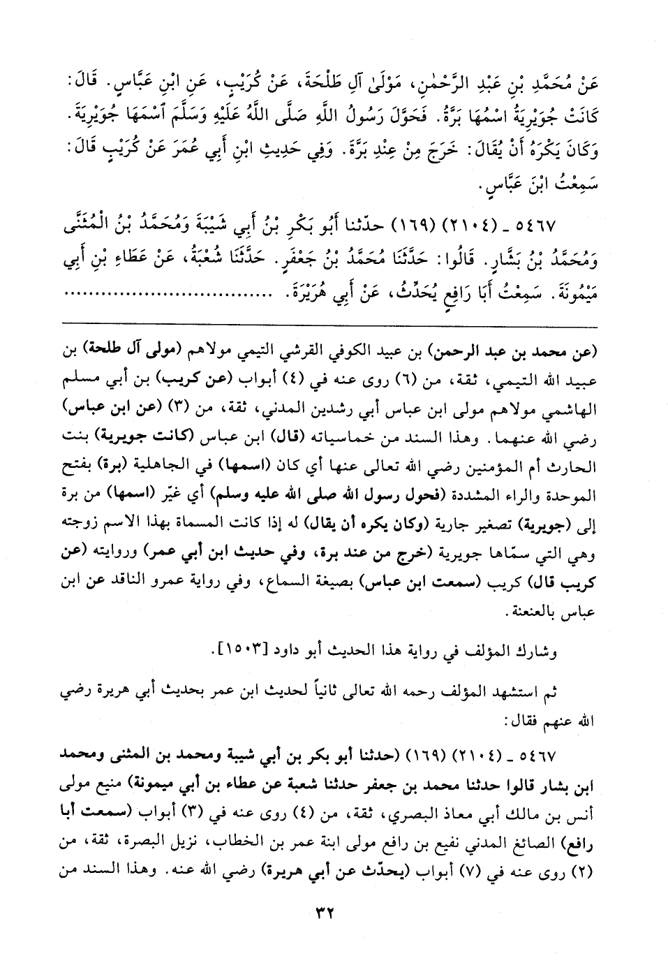 عَنْ مُحَمدِ بنِ عَبْدِ الرَّحمنِ، مَوْلى آلِ طَلْحَةَ، عَنْ كُرَيبٍ، عَنِ ابْنِ عَبَّاسٍ. قَال: كَانَتْ جُوَيرِيَةُ اسْمُها بَرَّةُ. فَحَوَّلَ رَسُولُ اللهِ صَلَّى اللَّهُ عَلَيهِ وَسَلَّمَ اسْمَها جُوَيرِيَةَ. وَكَانَ يَكْرَهُ أَنْ يُقَال: خَرَجَ مِنْ عِنْدِ بَرَّةَ. وَفِي حَدِيثِ ابْنِ أَبِي عُمَرَ عَنْ كُرَيبٍ قَال: سَمِعْتُ ابْنَ عَبَّاسٍ.