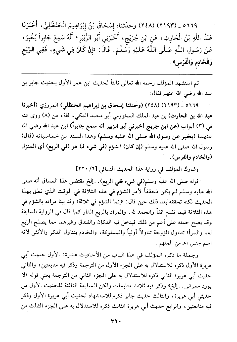 ٥٦٦٩ - (٢١٩٣) (٢٤٨) وحدّثناه إِسْحَاقُ بن إِبْرَاهِيمَ الْحَنْظَلِيُّ، أَخْبَرَنَا عَبْدُ اللهِ بْنُ الْحَارِثِ، عَنِ ابْنِ جُرَيجٍ، أَخْبَرَنِي أَبُو الزُّبَيرِ؛ أَنَّهُ سَمِعَ جَابِرًا يُخْبِرُ، عَنْ رَسُولِ اللهِ صَلى اللهُ عَلَيهِ وَسَلمَ. قَال: "إِنْ كانَ في شَيءٍ، فَفِي الرَّبْعِ وَالْخَادِمِ وَالْفَرَسِ"
