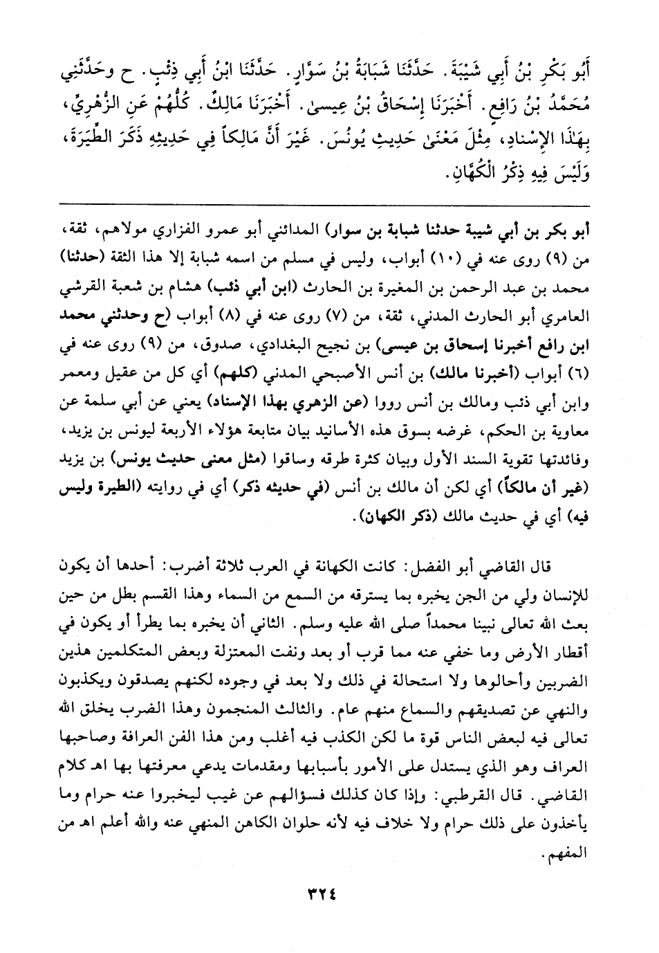 أَبُو بَكرِ بْنُ أبِي شَيْبَةَ. حَدَّثَنَا شَبَابَةُ بْنُ سَوَّارٍ. حَدَّثَنَا ابنُ أبِي ذِئْبٍ. ح وحَدَّثَنِي مُحَمَّدُ بْنُ رَافِعٍ. أَخْبَرَنَا إِسْحَاقُ بن عِيسى. أخْبَرَنَا مَالِكٌ. كُلُّهُمْ عَنِ الزُّهْرِيِّ، بِهَذَا الإِسْنادِ، مِثْلَ مَعْنَى حَدِيثِ يُونُسَ. غَيرَ أن مَالِكًا في حَدِيثِهِ ذَكَرَ الطِّيَرَةَ، وَلَيسَ فِيهِ ذِكْرُ الْكُهَّانِ
