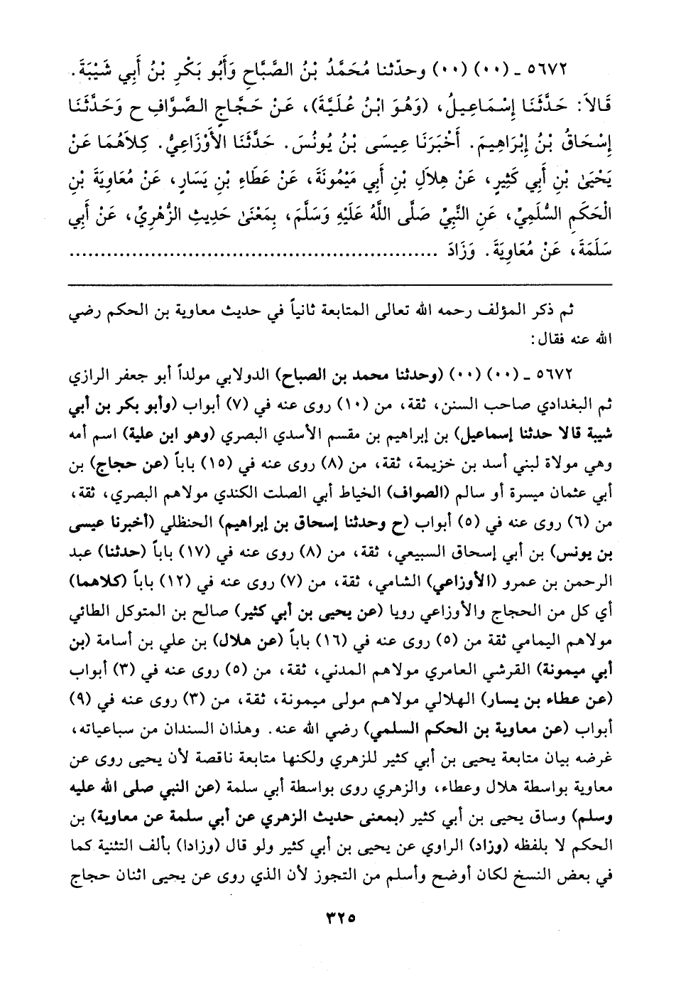 ٥٦٧٢ - (٠٠) (٠٠) (وحدثنا محمَّد بن الصباح) الدولابي مولدًا أبو جعفر الرازي ثم البغدادي صاحب السنن, ثقة، من (١٠) روى عنه في (٧) أبواب (وأبو بكر بن أبي شيبة قالا حدثنا إسماعيل) بن إبراهيم بن مقسم الأسدي البصري (وهو ابن علية) اسم أمه وهي مولاة لبني أسد بن خزيمة، ثقة، من (٨) روى عنه في (١٥) بابا (عن حجاج) بن أبي عثمان ميسرة أو سالم (الصواف) الخياط أبي الصلت الكندي مولاهم البصري، ثقة، من (٦) روى عنه في (٥) أبواب (ح وحدثنا إسحاق بن إبراهيم) الحنظلي (أخبرنا عيسى بن يونس) بن أبي إسحاق السبيعي، ثقة، من (٨) روى عنه في (١٧) بابا (حدثنا) عبد الرحمن بن عمرو (الأوزاعي) الشامي، ثقة، من (٧) روى عنه في (١٢) بابًا (كلاهما) أي كل من الحجاج والأوزاعي رويا (عن يحيى بن أبي كثير) صالح بن المتوكل الطائي مولاهم اليمامي ثقة من (٥) روى عنه في (١٦) بابا (عن هلال) بن علي بن أسامة (بن أبي ميمونة) القرشي العامري مولاهم المدني، ثقة، من (٥) روى عنه في (٣) أبواب (عن عطاء بن يسار) الهلالي مولاهم مولى ميمونة، ثقة، من (٣) روى عنه في (٩) أبواب (عن معاوية بن الحكم السلمي) رضي الله عنه. وهذان السندان من سباعياته، غرضه بيان متابعة يحيى بن أبي كثير للزهري ولكنها متابعة ناقصة لأن يحيى روى عن معاوية بواسطة هلال وعطاء، والزهري روى بواسطة أبي سلمة (عن النبي صلى الله عليه وسلم) وساق يحيى بن أبي كثير (بمعنى حديث الزهري عن أبي سلمة عن معاوية) بن الحكم لا بلفظه (وزاد) الراوي عن يحيى بن أبي كثير ولو قال (وزادا) بألف التثنية كما في بعض النسخ لكان أوضح وأسلم من التجوز لأن الذي روى عن يحيى اثنان حجاج