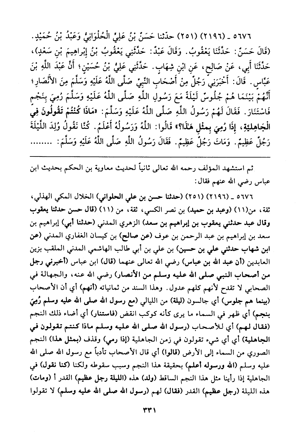 ٥٦٧٦ - (٢١٩٦) (٢٥١) حدَّثنا حَسَنٌ بن عَلِيٍّ الحُلوَانِيُّ وَعَبدُ بن حُمَيدٍ. (قَال حَسَنٌ: حَدَّثَنَا يَعْقُوبُ. وَقَال عَبْدٌ: حَدَّثَنِي يَعقُوبُ بن إِبراهِيمَ بنِ سَعْدٍ)، حَدَّثَنَا أَبِي، عَن صَالِحٍ، عَنِ ابْنِ شِهَابٍ. حَدَّثَنِي عَلِيُّ بن حُسَينٍ؛ أَنَّ عَبدَ اللهِ بنَ عَبَّاسٍ. قَال: أَخْبَرَنِي رَجُلٌ مِن أَصْحَابِ النبِي صَلى اللهُ عَلَيهِ وَسَلمَ مِنَ الأَنْصَارِ؛ أَنَّهُم بَينَمَا هُمْ جُلُوسٌ لَيلَةً مَعَ رَسُولِ اللهِ صَلى اللهُ عَلَيهِ وَسَلمَ رُمِيَ بِنَجْمِ فَاستَنَارَ. فَقَال لَهُمْ رَسُولُ اللهِ صَلى اللهُ عَلَيهِ وَسَلمَ: "مَاذَا كُنتُم تَقُولُونَ في الجَاهِليَّةِ، إِذَا رُمِيَ بِمثلِ هَذَا؟ " قَالُوا: اللهُ وَرَسُولُهُ أَعلَمُ. كُنا نَقُولُ وُلِدَ اللَّيلَةَ رَجُلٌ عَظِيمٌ. وَمَاتَ رَجُلٌ عَظِيمٌ. فَقَال رَسُولُ اللهِ صَلى اللهُ عَلَيهِ وَسَلمَ: