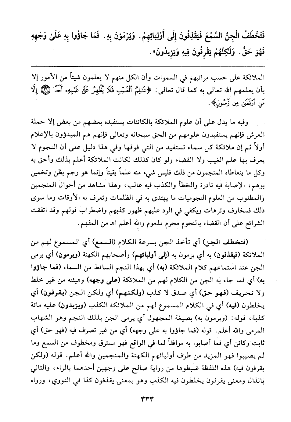 فَتَخْطَفُ الْجِنُّ السَّمْعَ فَيَقْذِفُونَ إِلَى أَوْلِيَائِهِم. وَيُرْمَوْنَ بِهِ. فَمَا جَاؤُوا بِهِ عَلَى وَجْهِهِ فَهُوَ حَقٌّ. وَلَكِنَّهُمْ يَقْرِفُونَ فِيهِ وَيَزِيدُونَ"