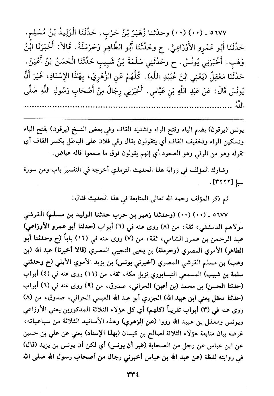 ٥٦٧٧ - (٠٠) (٠٠) (وحدّثنا زهير بن حرب حدثنا الوليد بن مسلم) القرشي مولاهم الدمشقي، ثقة، من (٨) روى عنه في (٦) أبواب (حدثنا أبو عمرو الأوزاعي) عبد الرحمن بن عمرو الشامي، ثقة، من (٧) روى عنه في (١٢) بابا (ح وحدّثنا أبو الطاهر) الأموي المصري (وحرملة) بن يحيى التجيبي المصري (قالا أخبرنا) عبد الله (بن وهب) بن مسلم القرشي المصري (أخبرني يونس) بن يزيد الأموي الأيلي (ح وحدّثني سلمة بن شبيب) المسمعي النيسابوري نزيل مكة، ثقة، من (١١) روى عنه في (٤) أبواب (حدثنا الحسن) بن محمَّد (بن أعين) الحراني، صدوق، من (٩) روى عنه في (٦) أبواب (حدثنا معقل يعني ابن عبيد الله) الجزري أبو عبد الله العبسي الحراني، صدوق، من (٨) روى عنه في (٣) أبواب تقريبًا (كلهم) أي كل هؤلاء الثلاثة المذكورين يعني الأوزاعي ويونس ومعقل بن عبيد الله رووا (عن الزهري) وهذه الأسانيد الثلاثة من سباعياته، غرضه بيان متابعة هؤلاء الثلاثة لصالح بن كيسان (بهذا الإسناد) يعني عن علي بن حسين عن ابن عباس عن رجل من الصحابة (غير أن يونس) أي لكن أن يونس بن يزيد (قال) في روايته لفظة (عن عبد الله بن عباس أخبرني رجال من أصحاب رسول الله صلى الله