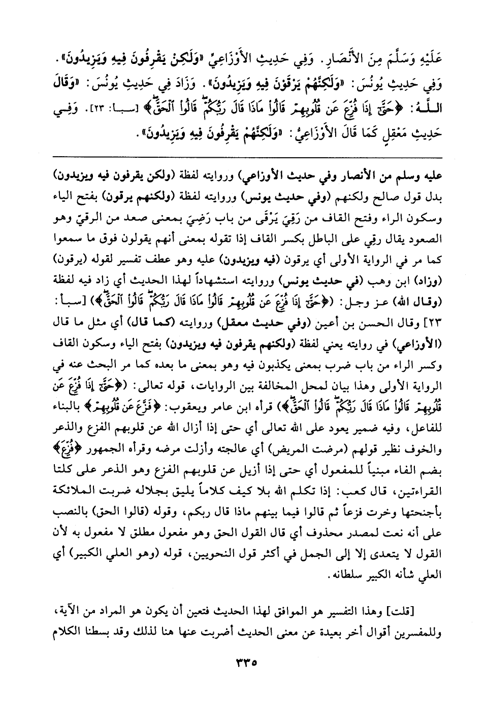 عَلَيهِ وَسَلَّمَ مِنَ الأَنْصَارِ. وَفِي حَدِيثِ الأَوْزَاعيِّ "وَلَكِن يَقْرِفُونَ فِيهِ وَيزِيدُونَ". وَفِي حَدِيثِ يُونُسَ: "وَلَكِنَّهُم يَرقَوْنَ فِيهِ وَيزيدُونَ". وَزَادَ في حَدِيثِ يُونُسَ: "وَقَال اللهُ: {حَتَّى إِذَا فُزِّعَ عَنْ قُلُوبِهِمْ قَالُوا مَاذَا قَال رَبُّكُمْ قَالُوا الْحَقَّ} [سبأ: ٢٣]. وَفِي حَدِيثِ مَعقِلٍ كَمَا قَال الأَوزَاعيُّ: "وَلَكِنَّهُم يَقْرِفُونَ فِيهِ وَيزِيدُونَ"