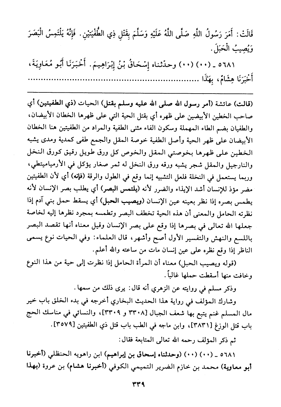 (قالت) عائشة (أمر رسول الله صلى الله عليه وسلم بقتل) الحيات (ذي الطفيتين) أي صاحب الخطين الأبيضين على ظهره أي بقتل الحية التي على ظهرها الخطان الأبيضان، والطفيان بضم الطاء المهملة وسكون الفاء مثنى الطفية والمراد من الطفيتين هنا الخطان الأبيضان على ظهر الحية وأصل الطفية خوصة المقل والجمع طفى كمدية ومدى يشبه الخطين على ظهرها بخوصتي المقل والخوص كل ورق طويل رقيق كورق النخل والنارجيل والمقل شجر يشبه ورقه ورق النخل له ثمر صغار يؤكل في الأرمياميتطي، وربما يستعمل في النخلة فلعل التشبيه إنما وقع في الطول والرقة (فإنه) أي لأن الطفيتين مضر مؤذ للإنسان أشد الإيذاء والضرر لأنه (يلتمس البصر) أي يطلب بصر الإنسان لأنه يطمس بصره إذا نظر بعينه عين الإنسان (ويصيب الحبل) أي يسقط حمل بني آدم إذا نظرته الحامل والمعنى أن هذه الحية تخطف البصر وتطمسه بمجرد نظرها إليه لخاصة جعلها الله تعالى في بصرها إذا وقع على بصر الإنسان وقيل معناه أنها تقصد البصر باللسع والنهش والتفسير الأول أصح وأشهر، قال العلماء: وفي الحيات نوع يسمى الناظر إذا وقع نظره على عين إنسان مات من ساعته والله أعلم.