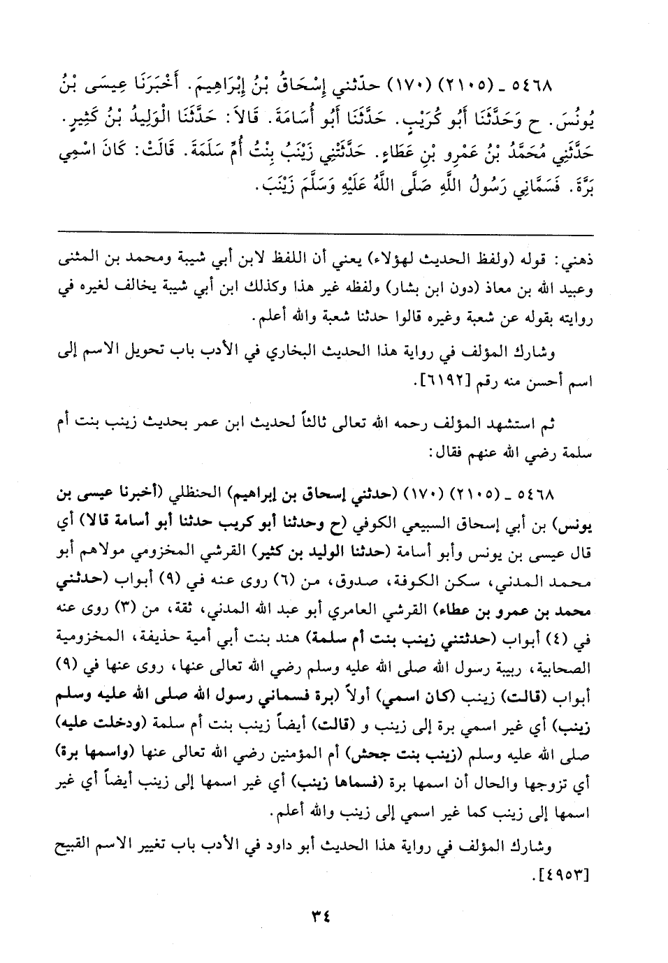 ٥٤٦٨ - (٢١٠٥) (١٧٠) (حدثني إسحاق بن إبراهيم) الحنظلي (أخبرنا عيسى بن يونس) بن أبي إسحاق السبيعي الكوفي (ح وحدثنا أبو كريب حدثنا أبو أسامة قال) أي قال عيسى بن يونس وأبو أسامة (حدثنا الوليد بن كثير) القرشي المخزومي مولاهم أبو محمد المدني، سكن الكوفة، صدوق، من (٦) روى عنه في (٩) أبواب (حدثني محمد بن عمرو بن عطاء) القرشي العامري أبو عبد الله المدني، ثقة، من (٣) روى عنه في (٤) أبواب (حدثتني زينب بنت أم سلمة) هند بنت أبي أمية حذيفة، المخزومية الصحابية، ربيبة رسول الله صلى الله عليه وسلم رضي الله تعالى عنها، روى عنها في (٩) أبواب (قالت) زينب (كان اسمي) أولًا (برة فسماني رسول الله صلى الله عليه وسلم زينب) أي غير اسمي برة إلى زينب و (قالت) أيضًا زينب بنت أم سلمة (ودخلت عليه) صلى الله عليه وسلم (زينب بنت جحش) أم المؤمنين رضي الله تعالى عنها (واسمها برة) أي تزوجها والحال أن اسمها برة (فسماها زينب) أي غير اسمها إلى زينب أيضًا أي غير اسمها إلى زينب كما غير اسمي إلى زينب والله أعلم.