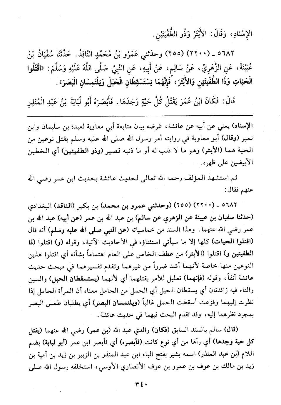 ٥٦٨٢ - (٢٢٠٠) (٢٥٥) وحدّثني عَمْرُو بْنُ محمد النَّاقِدُ. حَدَّثَنَا سُفْيَانُ بْنُ عُيَينَةَ، عَنِ الزُّهْرِيِّ، عَن سَالِمٍ، عَنْ أَبِيهِ، عَنِ النَّبي صلى اللهُ عَلَيهِ وَسَلمَ: "اقْتُلُوا الْحَيَّاتِ وَذَا الطُّفْيَتَينِ وَالأَبْتَرَ، فَإِنَّهُمَا يسْتَسْقِطَانِ الْحَبَلَ ويلْتمِسَانِ الْبَصَرَ".