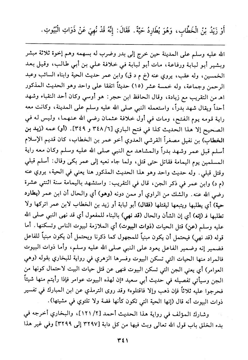 أَوْ زَيْدُ بن الْخَطَّابِ، وَهُوَ يُطَارِدُ حَيَّةً. فَقَال: إِنَّهُ قَدْ نُهِيَ عَن ذَوَاتِ الْبُيُوتِ