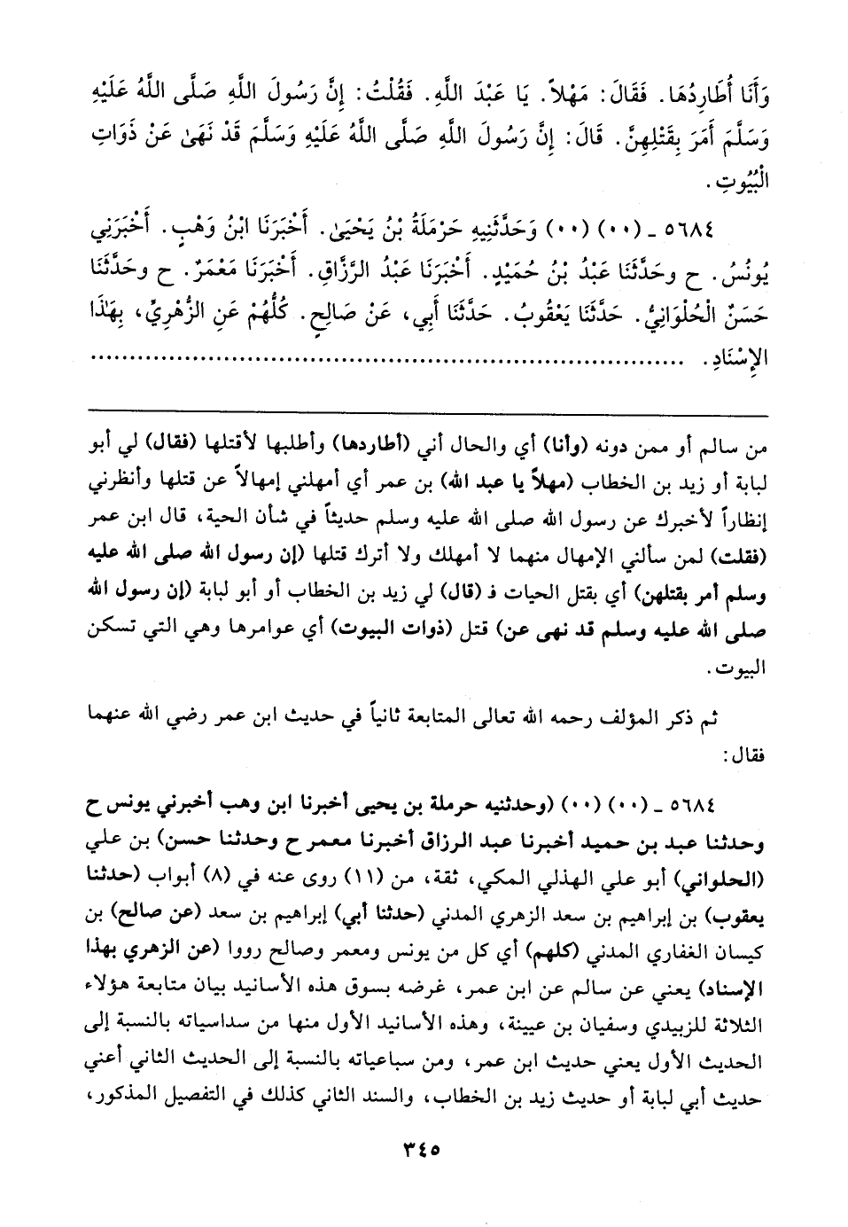 ٥٦٨٤ - (٠٠) (٠٠) (وحدثنيه حرملة بن يحيى أخبرنا ابن وهب أخبرني يونس ح وحدّثنا عبد بن حميد أخبرنا عبد الرزاق أخبرنا معمر ح وحدّثنا حسن) بن علي (الحلواني) أبو علي الهذلي المكي، ثقة، من (١١) روى عنه في (٨) أبواب (حدثنا يعقوب) بن إبراهيم بن سعد الزهري المدني (حدثنا أبي) إبراهيم بن سعد (عن صالح) بن كيسان الغفاري المدني (كلهم) أي كل من يونس ومعمر وصالح رووا (عن الزهري بهذا الإسناد) يعني عن سالم عن ابن عمر، غرضه بسوق هذه الأسانيد بيان متابعة هؤلاء الثلاثة للزبيدي وسفيان بن عيينة، وهذه الأسانيد الأول منها من سداسياته بالنسبة إلى الحديث الأول يعني حديث ابن عمر، ومن سباعياته بالنسبة إلى الحديث الثاني أعني حديث أبي لبابة أو حديث زيد بن الخطاب، والسند الثاني كذلك في التفصيل المذكور،