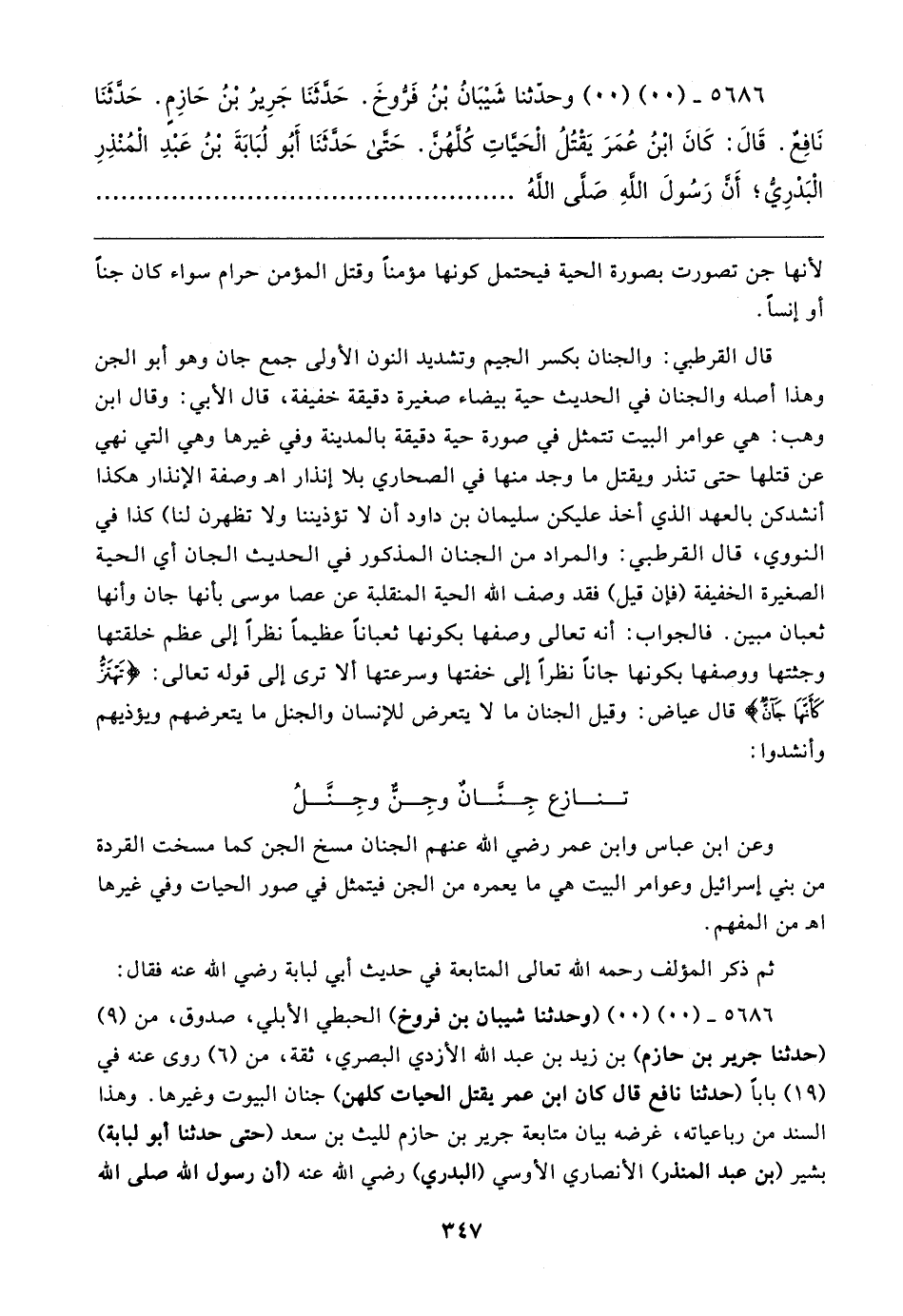 ٥٦٨٦ - (٠٠) (٠٠) (وحدّثنا شيبان بن فروخ) الحبطي الأبلي، صدوق، من (٩) (حدثنا جرير بن حازم) بن زيد بن عبد الله الأزدي البصري، ثقة، من (٦) روى عنه في (١٩) بابا (حدثنا نافع قال كان ابن عمر يقتل الحيات كلهن) جنان البيوت وغيرها. وهذا السند من رباعياته، غرضه بيان متابعة جرير بن حازم لليث بن سعد (حتى حدثنا أبو لبابة) بشير (بن عبد المنذر) الأنصاري الأوسي (البدري) رضي الله عنه (أن رسول الله صلى الله