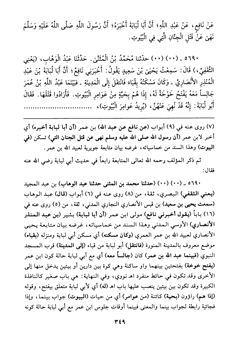 ٥٦٩٠ - (٠٠) (٠٠) حدَّثنا مُحَمَّدُ بْنُ المُثَنَّى. حَدَّثَنَا عَبْدُ الْوَهَّابِ، (يَعْنِي الثَّقَفِيَّ، ) قَال: سَمِعْتُ يَحيَى بنَ سَعِيدٍ يَقُولُ: أَخْبَرَنِي نَافِعٌ؛ أن أَبَا لُبَابَةَ بْنَ عَبدِ الْمُنْذِرِ الأَنْصَارِيَّ -وَكَانَ مَسْكَنُهُ بِقُبَاءَ فَانْتقَلَ إِلَى الْمَدِينَةِ- فبَينَمَا عَبْدُ اللهِ بْنُ عُمَرَ جَالِسًا مَعَهُ يَفْتَحُ خَوْخَةً لَهُ، إِذَا هُمْ بِحَيَّةٍ مِنْ عَوَامِرِ الْبُيُوتِ. فَأرَادُوا قَتْلَهَا. فَقَال أَبُو لُبَابَةَ: إِنَّهُ قَد نُهِيَ عَنْهُنَّ، (يُرِيدُ عَوامِرَ الْبُيُوتِ)،