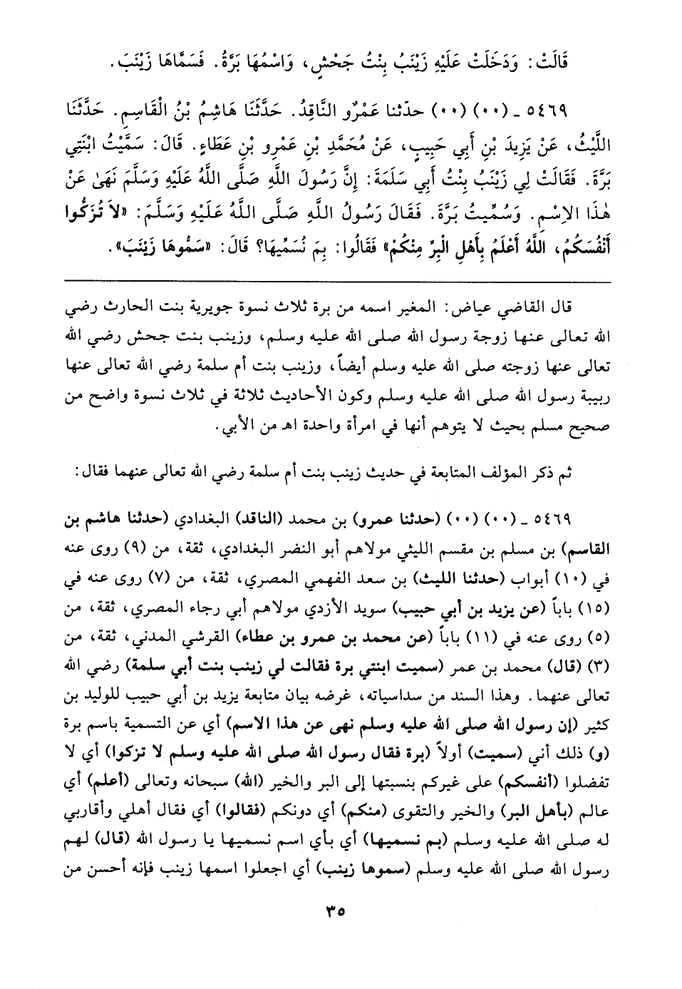 ٥٤٦٩ - (٠٠) (٠٠) (حدثنا عمرو) بن محمد (الناقد) البغدادي (حدثنا هاشم بن القاسم) بن مسلم بن مقسم الليثي مولاهم أبو النضر البغدادي، ثقة، من (٩) روى عنه في (١٠) أبواب (حدثنا الليث) بن سعد الفهمي المصري، ثقة، من (٧) روى عنه في (١٥) بابا (عن يزيد بن أبي حبيب) سويد الأزدي مولاهم أبي رجاء المصري، ثقة، من (٥) روى عنه في (١١) بابا (عن محمد بن عمرو بن عطاء) القرشي المدني، ثقة، من (٣) (قال) محمد بن عمر (سميت ابنتي برة فقالت في زينب بنت أبي سلمة) رضي الله تعالى عنهما. وهذا السند من سداسياته، غرضه بيان متابعة يزيد بن أبي حبيب للوليد بن كثير (إن رسول الله صلى الله عليه وسلم نهى عن هذا الاسم) أي عن التسمية باسم برة (و) ذلك أني (سميت) أولًا (برة فقال رسول الله صلى الله عليه وسلم لا تزكوا) أي لا تفضلوا (أنفسكم) على غيركم بنسبتها إلى البر والخير (الله) سبحانه وتعالى (أعلم) أي عالم (بأهل البر) والخير والتقوى (منكم) أي دونكم (فقالوا) أي فقال أهلي وأقاربي له صلى الله عليه وسلم (بم نسميها) أي باي اسم نسميها يا رسول الله (قال) لهم رسول الله صلى الله عليه وسلم (سموها زينب) أي اجعلوا اسمها زينب فإنه أحسن من
