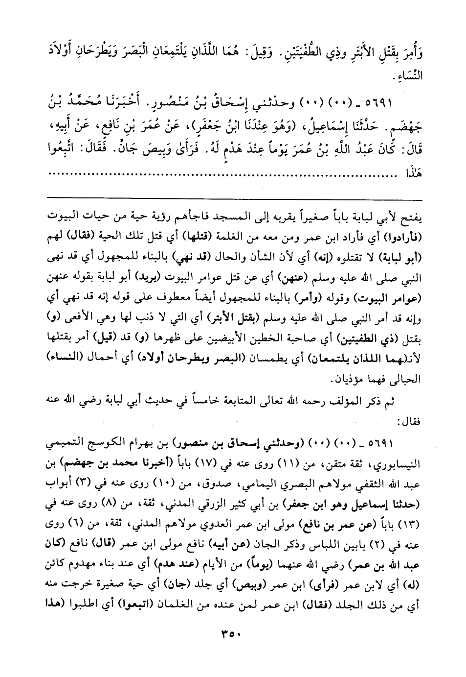 ٥٦٩١ - (٠٠) (٠٠) (وحدّثني إسحاق بن منصور) بن بهرام الكوسج التميمي النيسابوري، ثقة متقن، من (١١) روى عنه في (١٧) بابا (أخبرنا محمَّد بن جهضم) بن عبد الله الثقفي مولاهم البصري اليمامي، صدوق، من (١٠) روى عنه في (٣) أبواب (حدثنا إسماعيل وهو ابن جعفر) بن أبي كثير الزرقي المدني، ثقة، من (٨) روى عنه في (١٣) بابا (عن عمر بن نافع) مولى ابن عمر العدوي مولاهم المدني، ثقة، من (٦) روى عنه في (٢) بابين اللباس وذكر الجان (عن أبيه) نافع مولى ابن عمر (قال) نافع كان عبد الله بن عمر) رضي الله عنهما (يومًا) من الأيام (عند هدم) أي عند بناء مهدوم كائن (له) أي لابن عمر (فرأى) ابن عمر (وبيص) أي جلد (جان) أي حية صغيرة خرجت منه أي من ذلك الجلد (فقال) ابن عمر لمن عنده من الغلمان (اتبعوا) أي اطلبوا (هذا