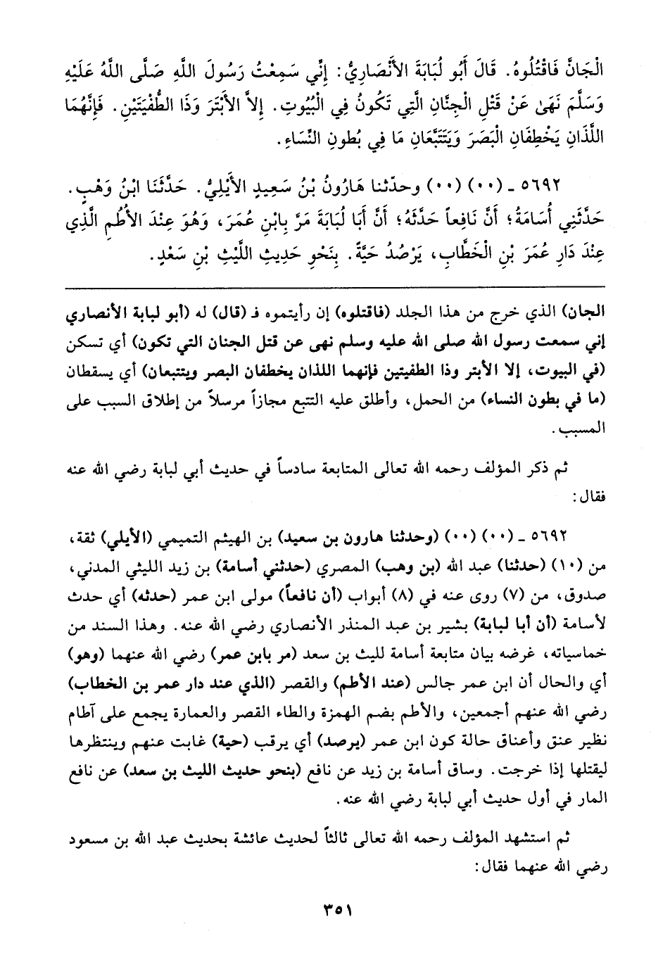 ٥٦٩٢ - (٠٠) (٠٠) (وحدّثنا هارون بن سعيد) بن الهيثم التميمي (الأيلي) ثقة، من (١٠) (حدثنا) عبد الله (بن وهب) المصري (حدثني أسامة) بن زيد الليثي المدني، صدوق، من (٧) روى عنه في (٨) أبواب (أن نافعًا) مولى ابن عمر (حدثه) أي حدث لأسامة (أن أبا لبابة) بشير بن عبد المنذر الأنصاري رضي الله عنه. وهذا السند من خماسياته، غرضه بيان متابعة أسامة لليث بن سعد (مر بابن عمر) رضي الله عنهما (وهو) أي والحال أن ابن عمر جالس (عند الأطم) والقصر (الدي عند دار عمر بن الخطاب) رضي الله عنهم أجمعين، والأطم بضم الهمزة والطاء القصر والعمارة يجمع على آطام نظير عنق وأعناق حالة كون ابن عمر (يرصد) أي يرقب (حية) غابت عنهم وينتظرها ليقتلها إذا خرجت. وساق أسامة بن زيد عن نافع (بنحو حديث الليث بن سعد) عن نافع المار في أول حديث أبي لبابة رضي الله عنه.