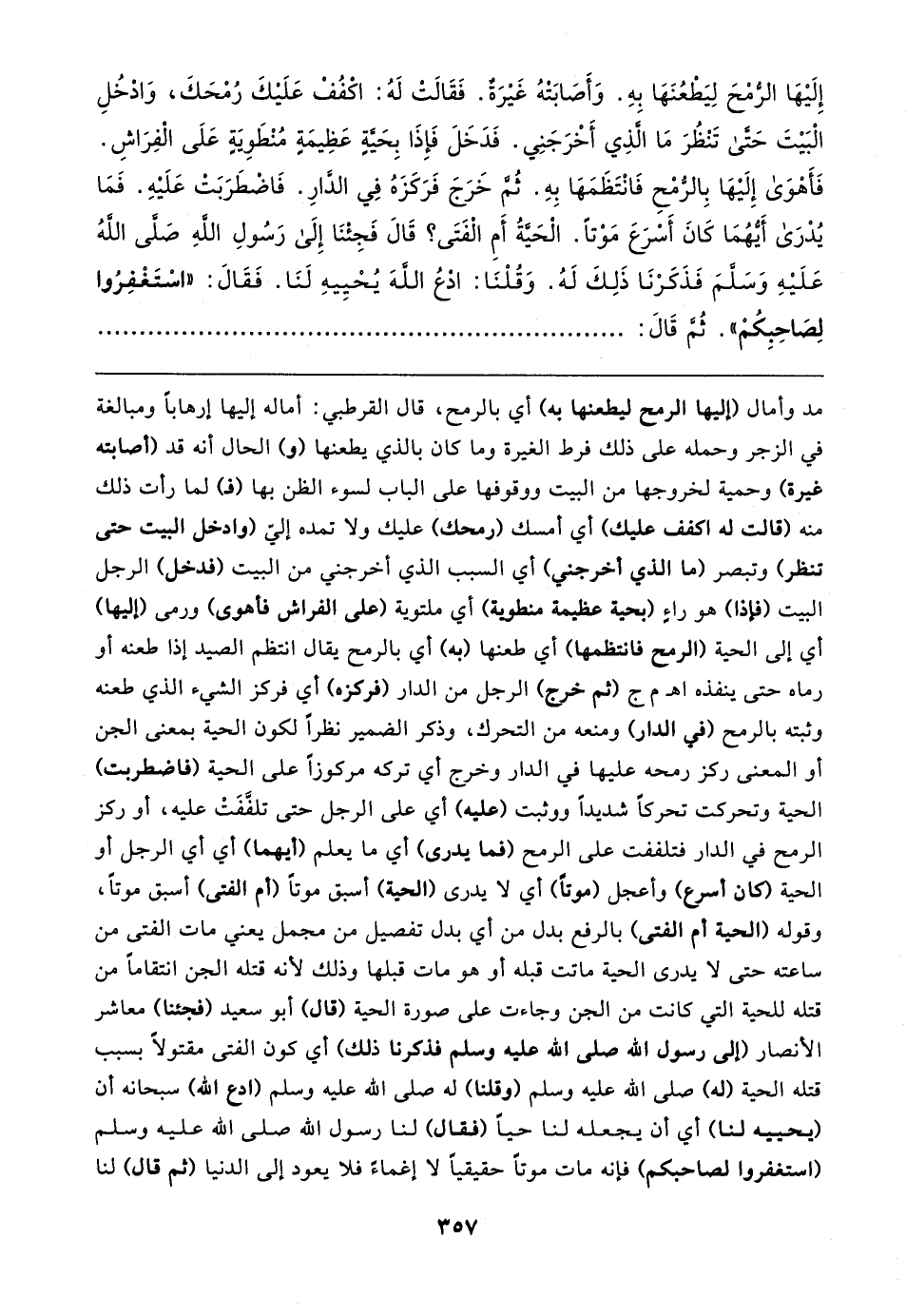 إِلَيْهَا الرُّمْحَ لِيَطْعُنَهَا بهِ. وَأَصَابَتْهُ غَيْرَةٌ. فَقَالتْ لَهُ: اكْفُفْ عَلَيكَ رُمْحَكَ، وَادْخُلِ الْبَيتَ حَتَّى تَنْظُرَ مَا الَّذِي أَخْرَجَنِي. فَدَخَلَ فَإِذَا بِحَيَّةٍ عَظِيمَةٍ مُنْطَويَةٍ عَلَى الْفِرَاشِ. فَأَهْوَى إِلَيهَا بِالرُّمْحِ فَانْتَظَمَهَا بِهِ. ثُمَّ خَرَجَ فَرَكَزَهُ في الدَّارِ. فَاضْطَرَبَتْ عَلَيهِ. فَمَا يُدْرَى أَيُّهُمَا كَانَ أَسْرَعَ مَوْتًا. الْحَيَّةُ أَمِ الْفَتَى؟ قَال فَجِئْنَا إِلَى رَسُولِ اللهِ صَلى اللهُ عَلَيهِ وَسَلمَ فَذَكَرْنَا ذَلِكَ لَهُ. وَقُلْنَا: ادْعُ اللهَ يُحْيِيهِ لَنَا. فَقَال: "اسْتَغْفِرُوا لِصَاحِبِكُمْ". ثُم قَال:
